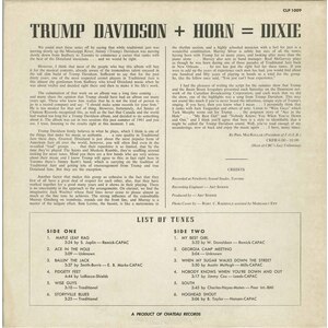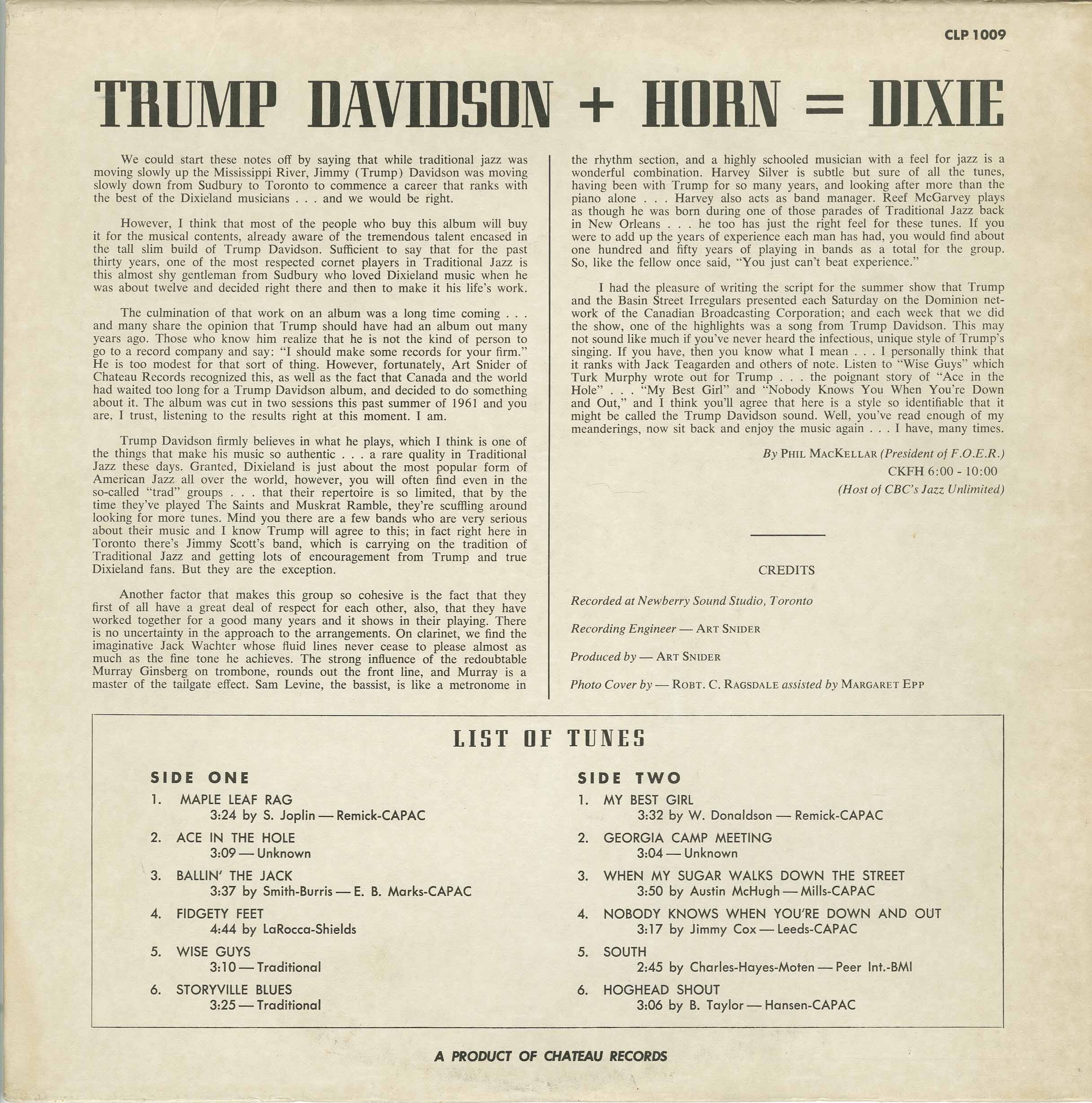 Jimmy (James Douglas) Davidson, "Trump" after ca 1936. Cornetist, singer, arranger, b Sudbury, Ont, 26 Nov 1908, d there 2 May 1978. A pioneer and promoter of jazz in Canada, he played trumpet at age 12 with the Canadian Legion Band in Sudbury and formed the Melody Five, one of the earliest jazz-styled groups in Canada (1925). Moving to Toronto, he worked 1929-36 with Luigi Romanelli (first as a singer, then as a cornet soloist and arranger, and occasionally as a baritone saxophonist) and briefly in 1935 with Rex Battle's dance band.