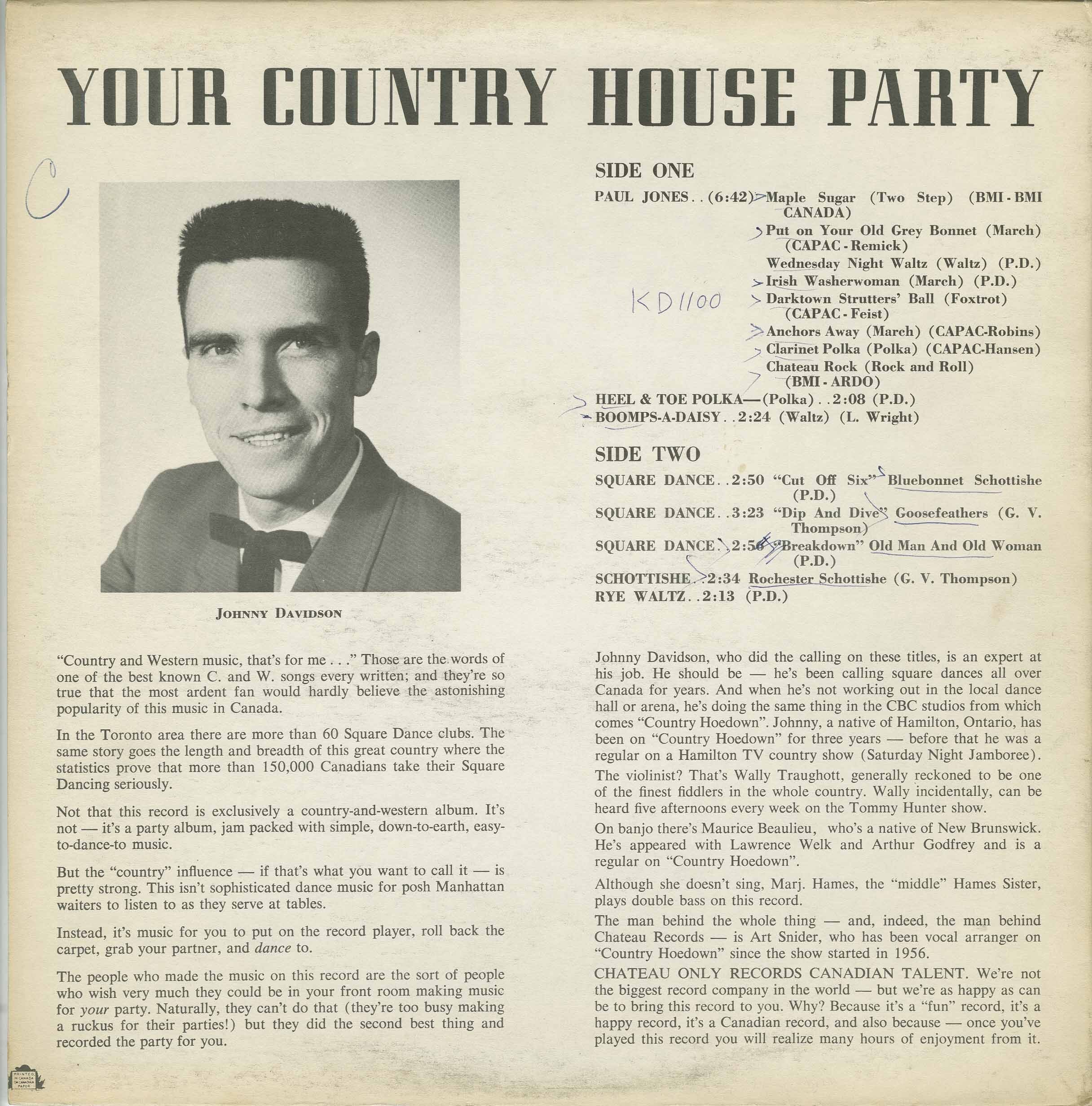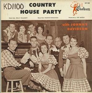 Here is the first of 16 Chateau releases prior to morphing into the Canatal label. Art Snider's first production of mostly western square dance numbers, as called by Johnny Davidson with Wally Traugott on fiddle, Marj Hames (one of the Hames Sisters) on double bass, and Maurice Beaulieux on banjo. Gordon Lightfoot is at the very centre of the group on the front cover, beside the older gentleman, but he is not acknowledged as performing on this recording (may be a back-up singer). At this time, Gordon was with the group the Singin' Swingin' Eight and they released a single containing 6 tracks (Canatal Records CTC 403