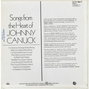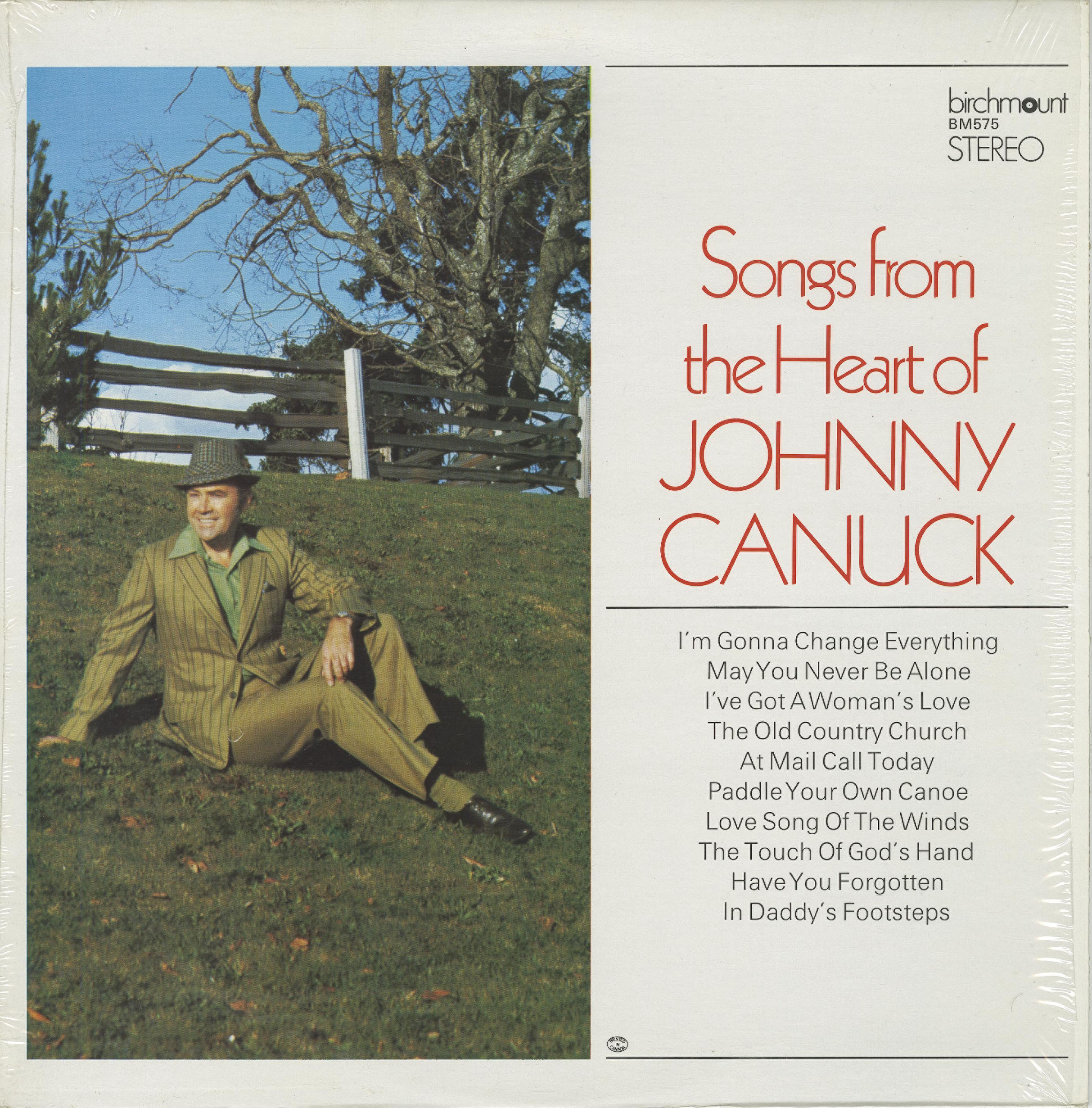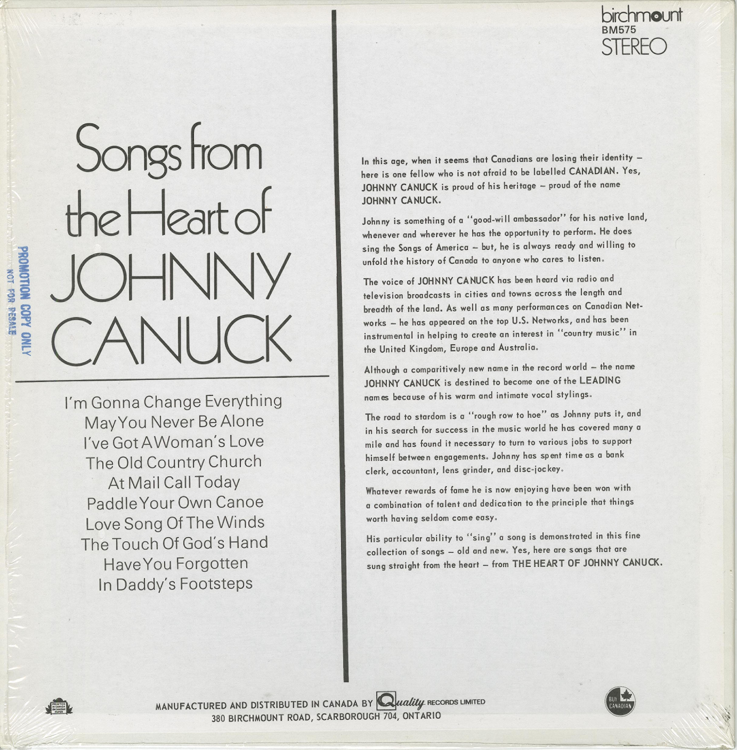 "In this age, when it seems that Canadians are losing their identity – here is one fellow who is not afraid to be labeled CANADIAN. Yes, JOHNNY CANUCK is proud of his heritage – proud of the name JOHNNY CANUCK. Johnny is something of a “good-will ambassador” for his native land, whenever and wherever he has the opportunity to perform. He does sing the Songs of America – but he is always ready and willing to unfold the history of Canada to anyone who cares to listen.The voice of JOHNNY CANUCK has been heard via radio and television broadcasts in cities and towns across the length and breadth of the land. As well as many appearances on Canadian Networks – he has appeared on the top U.S. Networks, and has been instrumental in helping to create an interest in “country music” in the United Kingdom, Europe and Australia. Although a comparatively new name in the record world – the name JOHNNY CANUCK is destined to become one of the LEADING names because of his warm and intimate vocal stylings. The road to stardom is a “rough row to hoe” as Johnny puts it, and in his search for success in the music world he has covered many a mile and has found it necessary to turn to various jobs to support himself between engagements. Johnny has spent time as a bank clerk, accountant, lens grinder, and disc jockey. Whatever rewards of fame he is now enjoying have been won with a combination of talent and dedication to the principle that things worth having seldom come easy. His particular ability to “sing” a song is demonstrated in this fine collection of songs – old and new. Yes, here are songs that are sung straight from the heart – from THE HEART OF JOHNNY CANUCK."