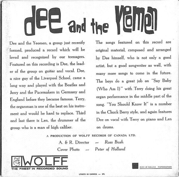 After six months in France, Dunnett moved to North America in 1963, believing that Canada offered better prospects than the UK. Settling in Toronto, he sought musicians capable of supporting his vision of a professional recording and touring band. In the autumn of 1963 he connected with Terry Watkinson of Fort William (formerly of Sonny & the Sequins) and Toronto drummer Len Lytwyn. Together they recorded their first single, “Say Baby (Who Am I)” b/w “You Should Know It.” The record received sufficient attention that the trio formally adopted the name Dee and the Yeomen in early 1964.