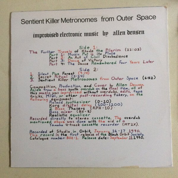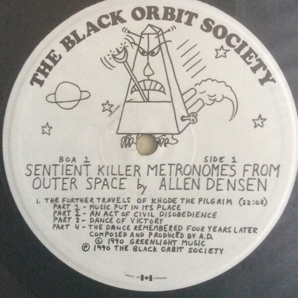 Encouraged by a friend, Allen Densen, who up to that point had been quietly and modestly playing and recording synthesizers and drum machines at home for his own pleasure, decided to release an LP. As it happened, Sentient Killer Metronomes from Outer Space was one of the very last records pressed in Canada before all the pressing plants closed shop in the early 90's. Allegedly it was so close to the end of the line that there wasn’t even time for a test pressing.