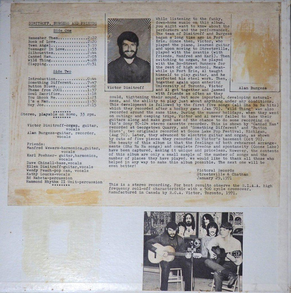 While listening to the funky, down-home music on this album, you might want to know about the performers and the performances. The team of Dimitroff and Burgess began a long time ago in Fort Erie. Since then, Victor, who played the piano, learned guitar and upon moving to Streetsville, played with the Avantis (with friends, Manfred and Karl). Then switching to organ, he played with the Bo-Street Runners for the rest of high school. Meanwhile in Fort Erie, Al taught himself to play guitar, and he perfected his steel work. Then, together again upon entering University of Toronto, Victor and Al got together and jammed with friends as often as they could, tightening their sound, but more important, developing natural-ness, and the ability to play just about anything under any conditions. This development is followed by the first five songs (all Sha Na Na hits) which they recorded after a hockey game (Jan '70). 'Wild Thing' was also recorded around the same time.