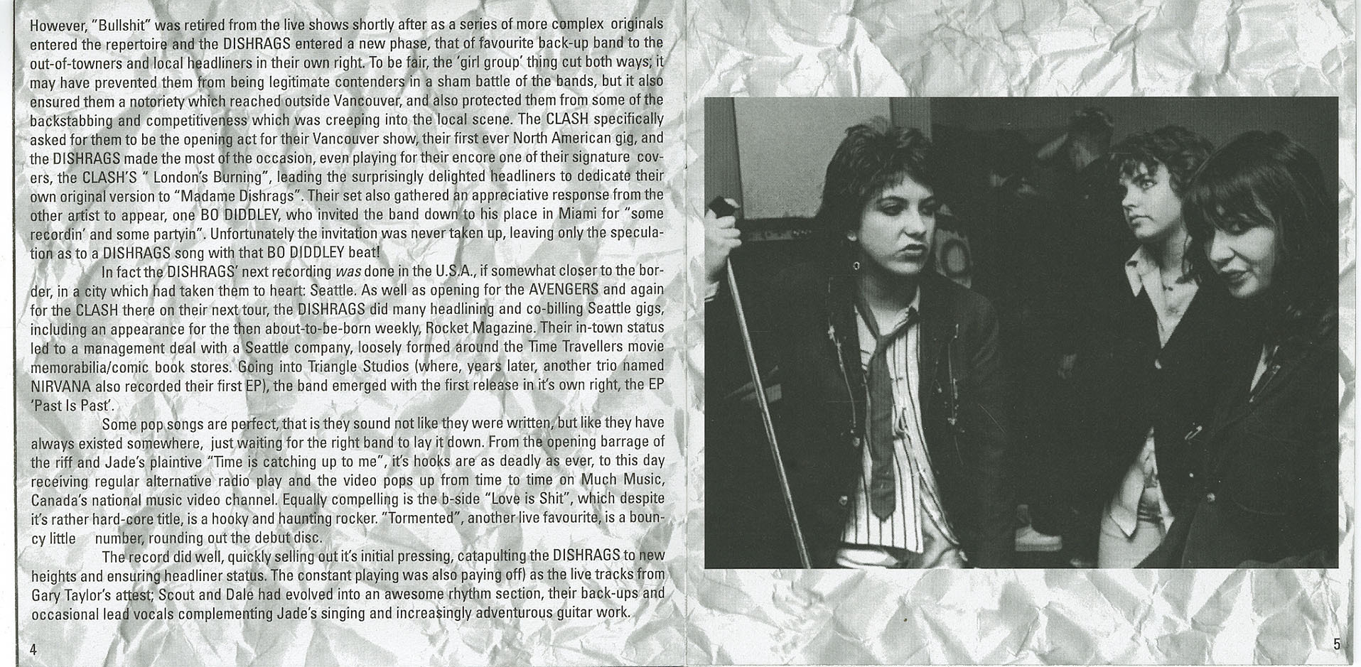 Later that year, the Dishrags recorded their first studio EP, Past Is Past, in Seattle at Triangle Studios (where Nirvana would later cut their debut). The title track, featuring the lyric “Time is catching up to me,” was a lean, emotionally sharp punk-pop song that received alternative radio play and became one of the band’s signature numbers. The EP also included “Love Is Shit,” a darker, moody track that showed the band expanding its sonic palette, and the bristling “Tormented,” which became a live staple. Despite its limited release, Past Is Past solidified the Dishrags’ growing following and led to gigs with the Avengers, more shows with the Clash, and headlining slots in Seattle.