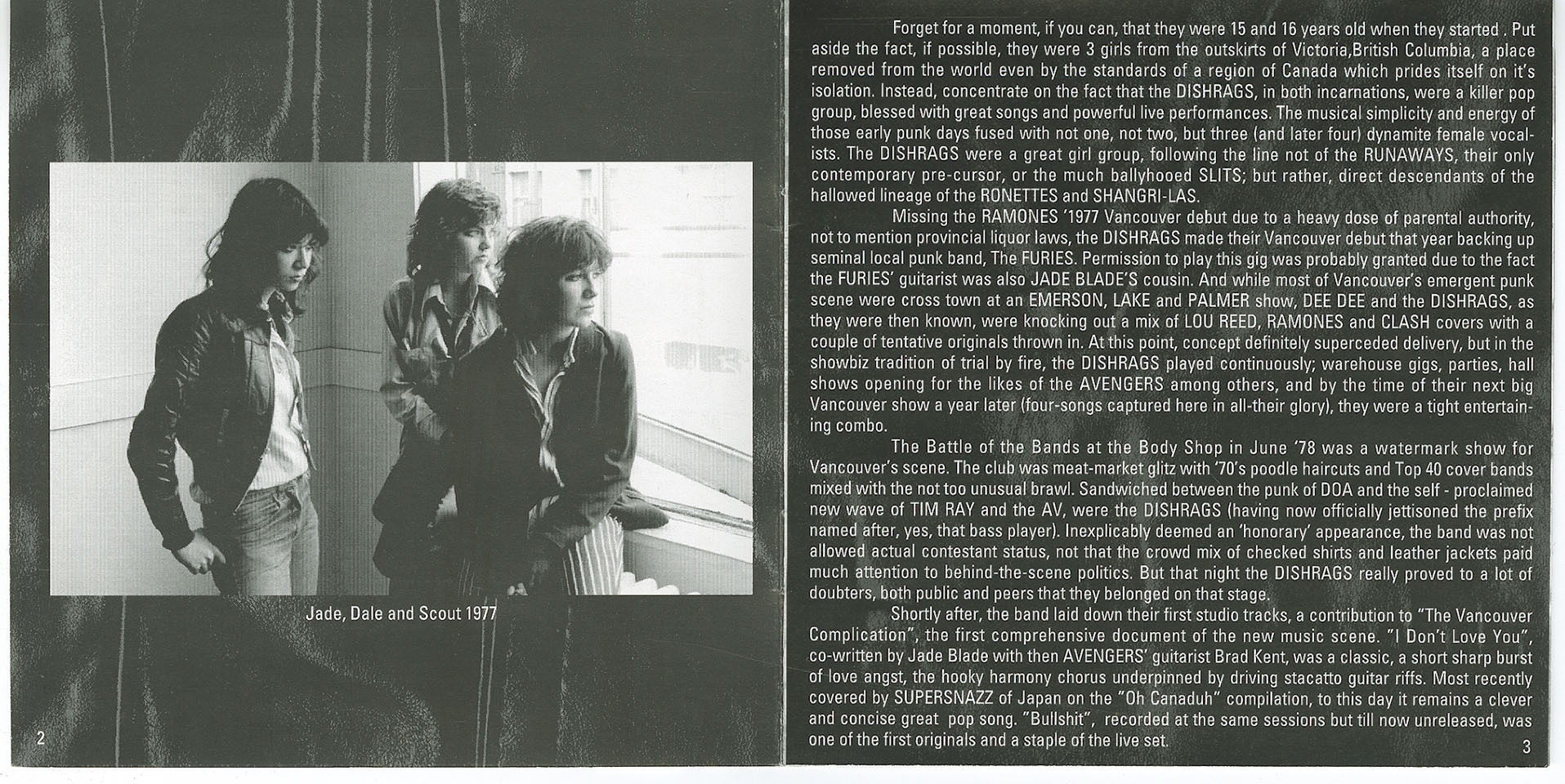 Formed in Victoria, British Columbia in 1977 by three teenage girls barely out of high school, The Dishrags hold a historic place as one of Canada’s first female punk bands — and among the earliest all-female punk groups anywhere in North America. With Jade Blade (guitar, vocals), Dale Powers (bass, vocals), and Scout (drums, vocals), the group exploded onto the nascent Vancouver punk scene with a fierce, primitive energy that placed them alongside bands like D.O.A., the Furies, the Pointed Sticks, and the Subhumans. Yet unlike most of their peers, the Dishrags would remain an all-women unit through their career, challenging the era’s entrenched misogyny by sheer force of will, talent, and determination.