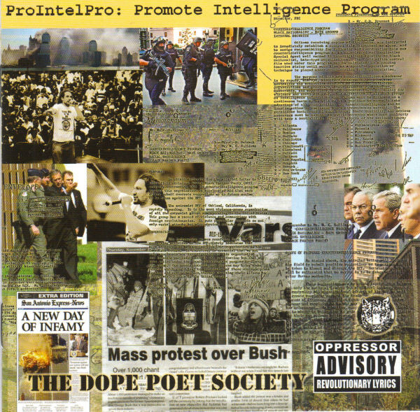 Never afraid to make targets of American presidents and Canadian prime ministers Dope Poet Society unleashes open warfare with beats that pop like cannon blasts and words that sting like poison arrows against anyone who stands for injustice and intolerance on ProIntelPro. On tracks such as "Bushit and "9/11 World Trade, attacks are open and accusations fly against the real terrorists in the world. Check "All of Us, a multi-lingual track that champions unity as the greatest weapon against oppression or "Amazing where Professor D unleashes a volley of criticism against MCs not saying anything. Taking influences from the granddaddies of militant hip-hop Public Enemy and KRS-One, Dope Poets Society lead the next charge against ignorance and greed. Combining positive lyrics based on positive social change with driving beats that scream revolution, ProIntelPro flows with militant chants and a touch of sly humour. With fists standing firmly in the air, Professor D, Belladonna and DJ Spinister have crafted a collection of stomping beats and spit-fire lyrics with a DIY ethic that is the soundtrack to your next political rally.