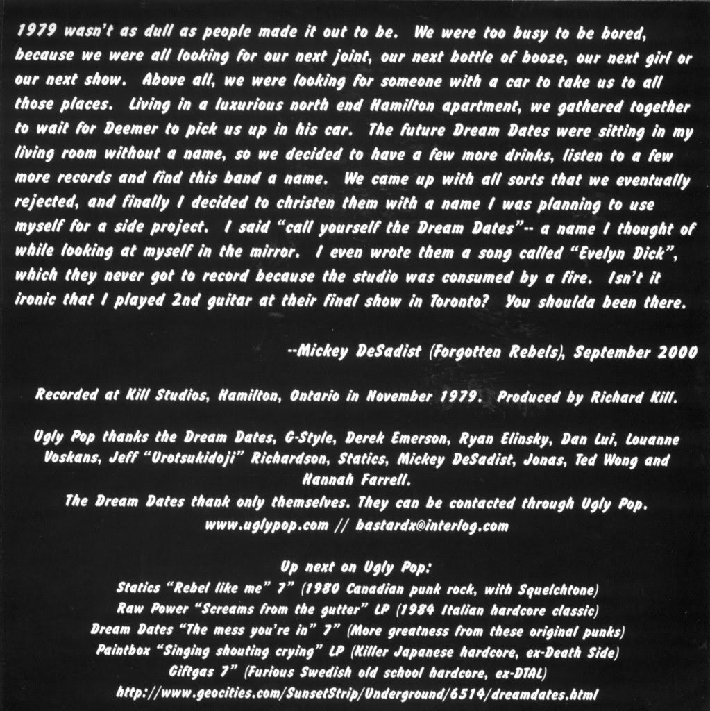 The Dream Dates continued gigging regularly through the early 1980s but never returned to the studio. As punk fragmented into new wave, rockabilly revival, and eventually hardcore, the band dissolved in 1982. Members went on to remain active within the underground, with Fix later fronting groups such as The Manglers, The Kimona Nails, The Chosen Few, and Zombie Sea Serpants of Love, while maintaining close ties to figures within the Forgotten Rebels orbit.