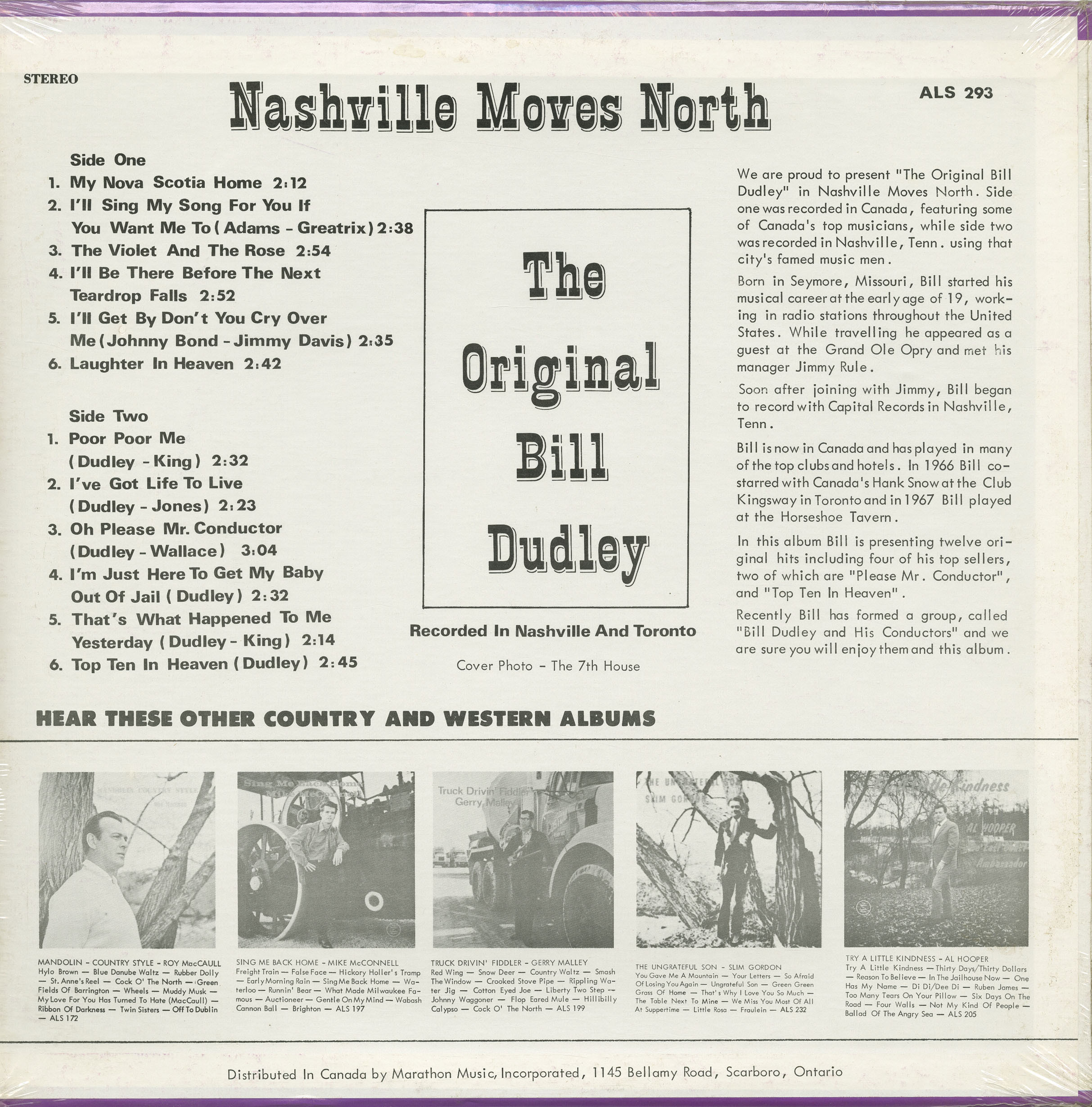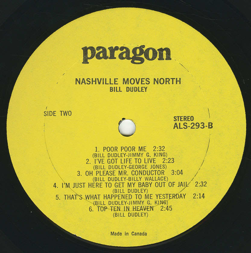 We are proud to present "The Original Bill Dudley" in Nashville Moves North. Side one was recorded in Canada, featuring some of Canada's top musicians, while side two was recorded in Nashville, Tenn. using that city's finest music men.