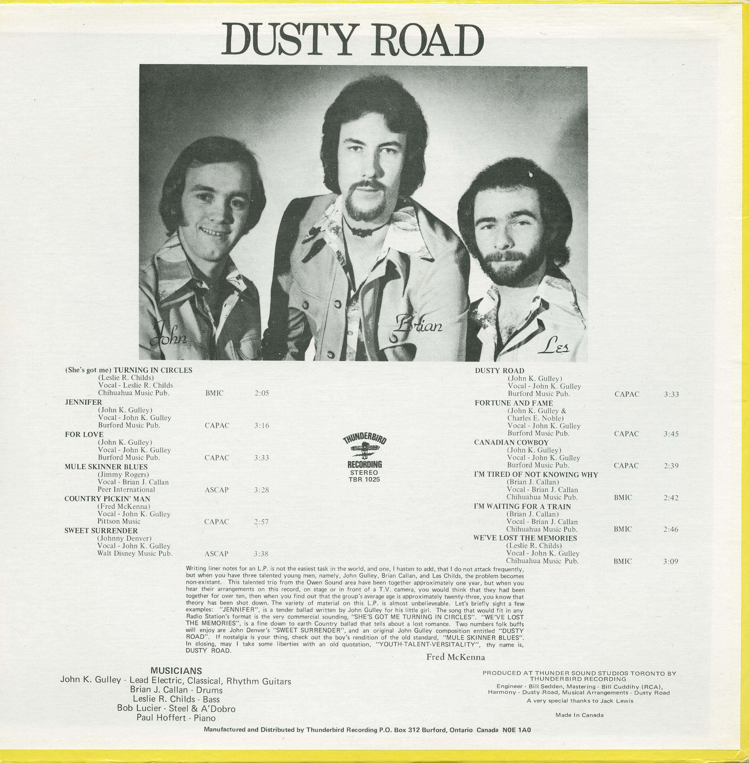 Formed in Ontario in the mid-1970s, Dusty Road was a Canadian country and country-rock trio featuring John K. Gulley (lead electric, classical, and rhythm guitars, vocals), Brian J. Callan (drums, vocals), and Leslie R. Childs (bass, vocals). They were joined on their recordings by Bob Lucier (steel guitar, dobro) and Paul Hoffert (piano). All three members sang lead, giving the group a distinctive vocal versatility.