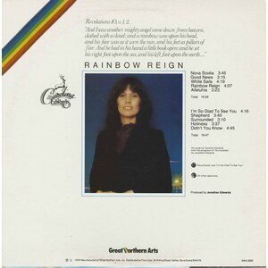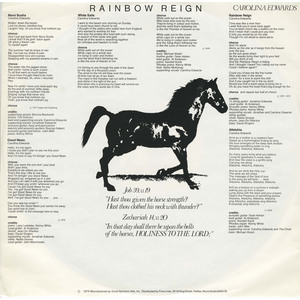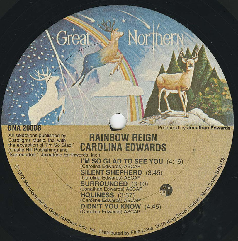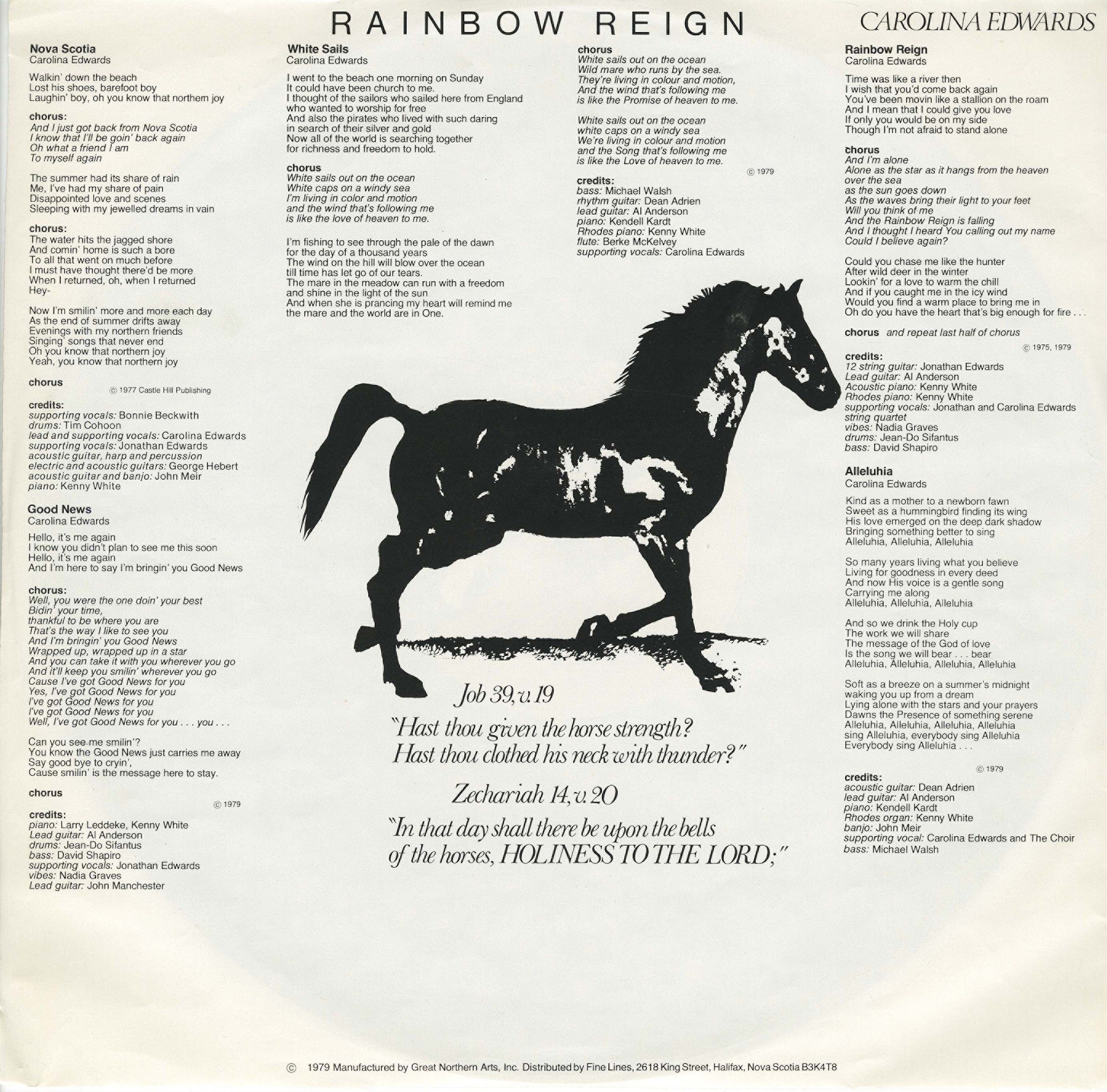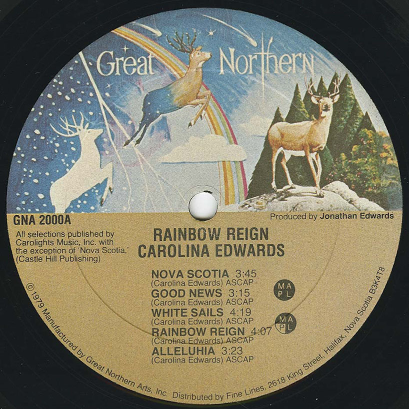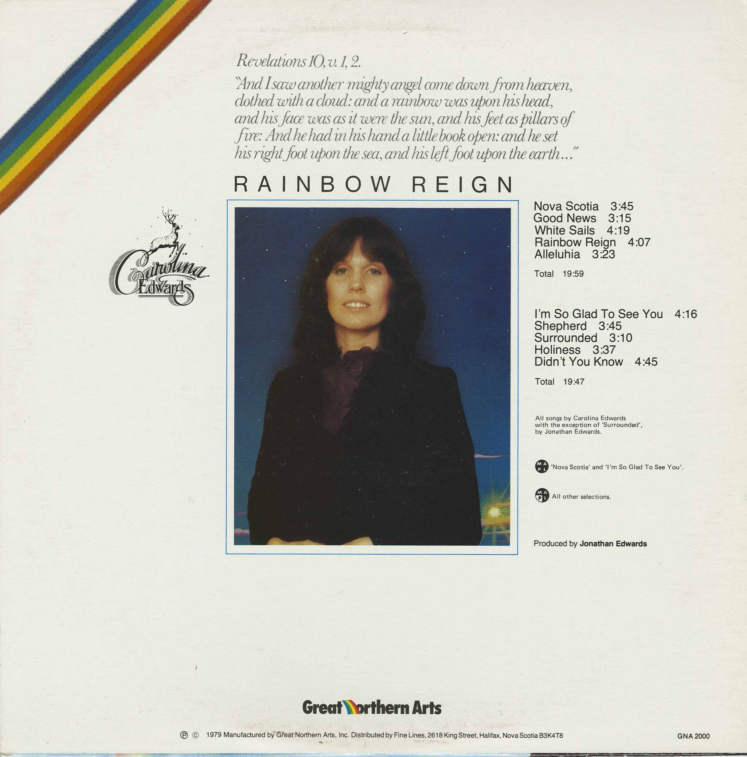 Carolina Edwards was married to Jonathan Edwards, an American draft dodger / singer, best known for the song about his wife entitled "Carolina, Caroline". Carolina and Jonathan spent time in Pictou, Nova Scotia. Besides the popular "Nova Scotia", she also co-wrote the lyrics to Johnny Cash's song "Girl from the Canyon". Rainbow Reign was produced by Jonathan Edwards. Carolina is now known as Serah. Serah donates all proceeds of her music to the WORLD FAMILY FOUNDATION. World Family Foundation is a non-profit charitable foundation that gives to various environmental and humanitarian causes. Music heals!