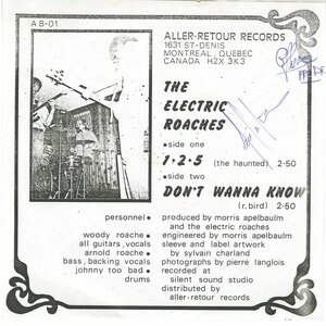 Axis was a band that formed in 1966 and played rock and garage music in and around the the local circuit in Montréal, Québec. They disbanded in 1969 without a recording to their credit. In 1985, they set history straight and reformed under the name The Electric Roaches, with a different drummer. They laid down a couple of superb interpretations including their own unique version of the Haunted's "1-2-5". The b side is credited to Ronnie bird, but in reality the music is a knock-off of " I Can't Give You Everything" with original lyrics.