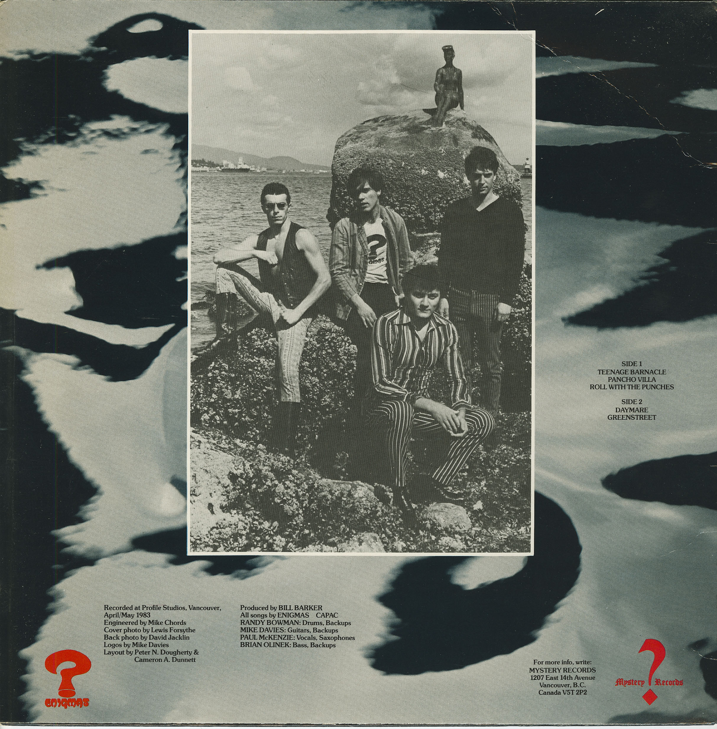 Paul McKenzie (lead vocals saxophone), Mike Davies (lead guitar) and Brian Olinek (bass guitar) originally came together in Vancouver's blossoming punk rock scene with a shared interest in garage rock and sixties instrumentals. At first, they busked outside liquor stores as the Bone-a-Partes. However, when the band discovered a French garage rock act had already appropriated the name, McKenzie suggested renaming themselves the Enigmas. In March 1982 they hired Cam Beck (drums) and the band played their debut gig at the Smilin' Buddha with the Greasy Spoons, one of McKenzie's former groups.