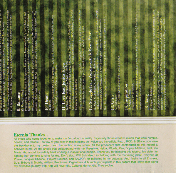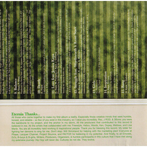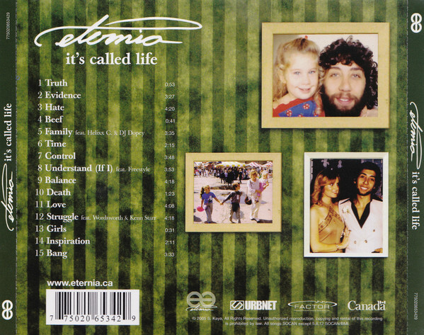 International media have labelled her "Canadas dopest female MC; and with the release of her debut album, Eternia is also a champion of perseverance in Canadian hip-hop. Its Called Life is about all the elements in Eternias struggle that have made her the strong MC she is today and each song is titled after these elements. Her confident flow spills over onto the clean mid-tempo bumping track "Evidence, about how she got into the rap game on her own terms. "Hate gets first prize for the thickest, cockiest, in your-face "F-you! to the haters, making it a track of the year. Pieces of Eternias story are woven throughout the album in a way that each one matches the mood of the music. "Control is a brutally harmonious and brutally honest song about a control-freak ex-boyfriend. Eternias creativity balances the diary effect of her albums candid content, and keeps it fresh. "Understand, featuring Freedstyle, is about the hectic trails of MCs on the road trying to make it. This same theme is flipped on "Balance, a smoothed-out track about her love and support from both Canada and the United States. Eternias talent and intelligence, both developed yet unforced, make this debut a proud statement. Now that shes elbowed her way into the game, shes bound to soak up a lot more serious experiences to refine into real rap music. (Urbnet)