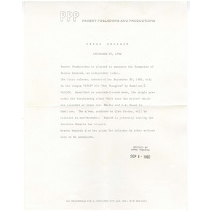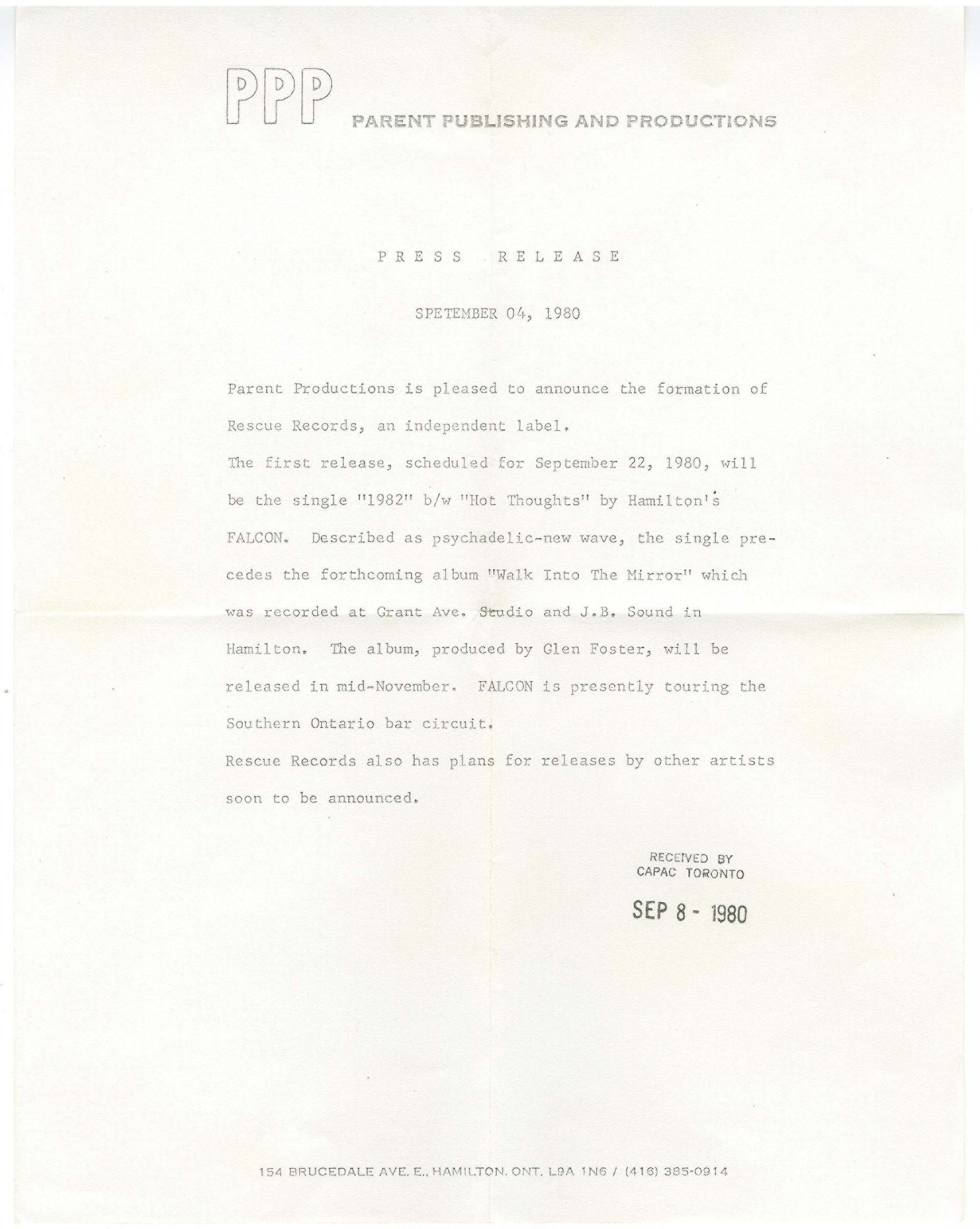 First indie Rescue Records release by Glen Foster and Falcon, dated September 12, 1980. They originally formed in Hamilton, Ontario and described themselves as psychadelic-new wave.