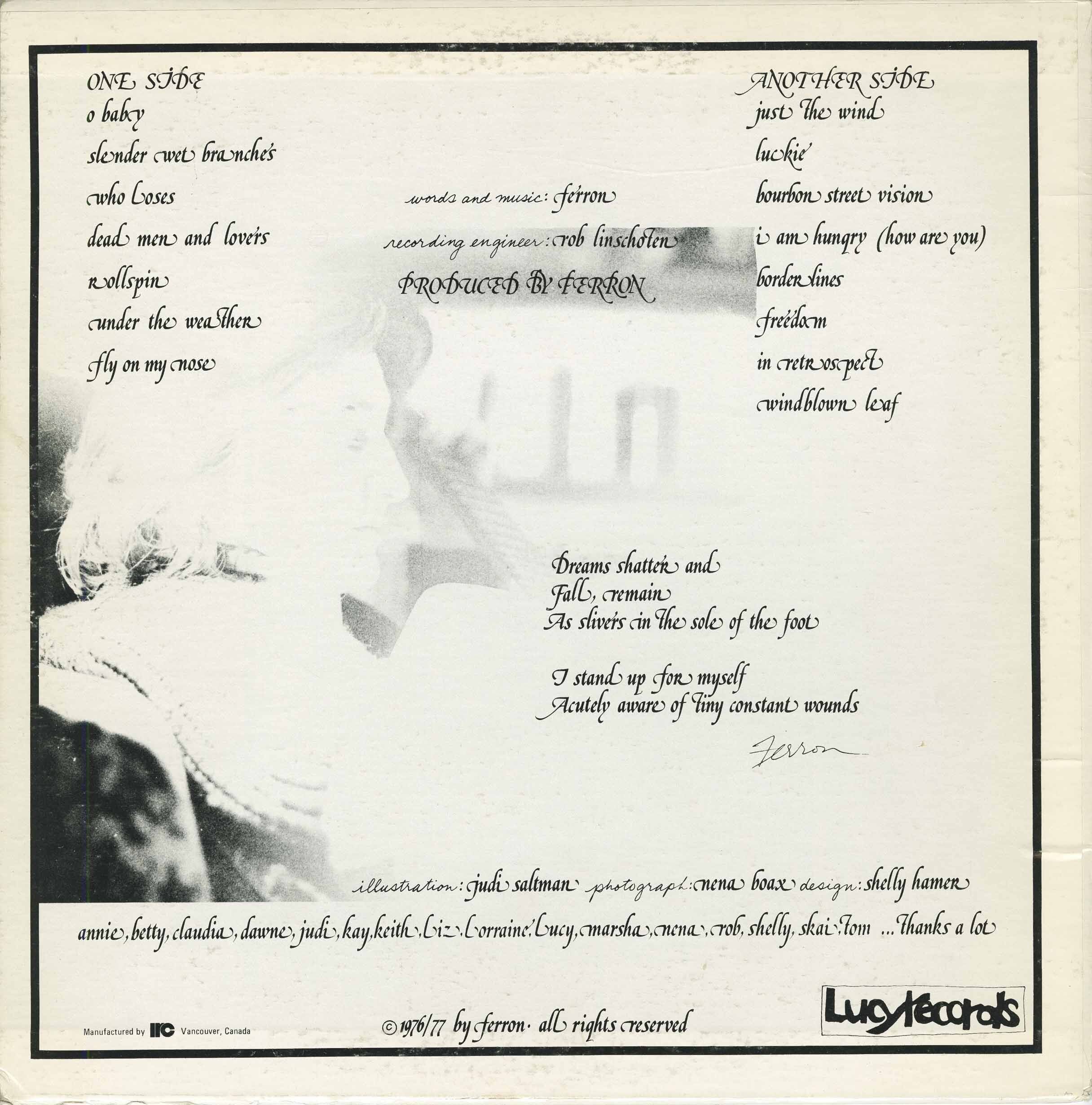 Ferron’s self-titled debut was self-released on Lucy Records in 1977. Only a thousand copies were pressed, and she has since expressed her dissatisfaction with it, and her second album, “Backed Up.” I do not know what the exact status of the album’s future is, but it seems highly unlikely that it will ever be re-released. I would be curious to know if she even still has the master tapes, and what state they might be in after thirty years.