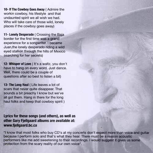 The familiar Fjellgaard theme of vanishing values includes Vaqueros in "If the Cowboy Goes Away," becoming comical in "Lonely Desperado," a cowboy waltz "Whisper of Love" and a final message, "The Long Haul."