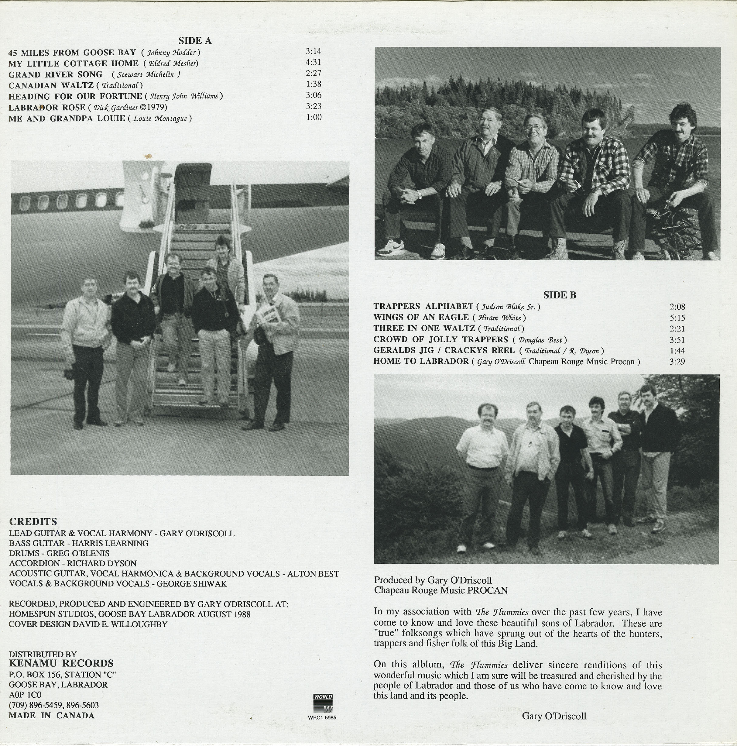 Recorded, produced and engineered by Gary O'Driscoll for Chapeau Rouge Music at Homespun Studios, Goose Bay, Labrador, August, 1988