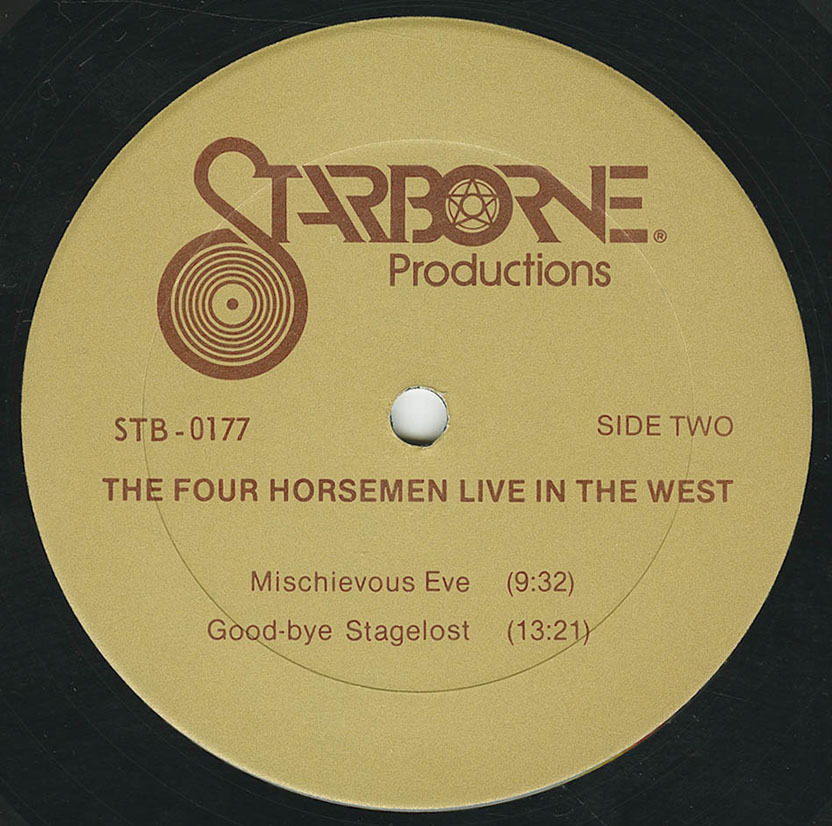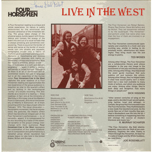 A Four Horsemen reading is a unique and whole experience. Its nature is subtly determined by the emotional and acoustic ambience of the immediate setting. The group takes charge of the physical space, builds rapport with the audience and funnels the energy of the event into and out of a vocal tornado that is always arresting and sometimes overpowering. There is sound at the border of sense and sense at the border of sound, words torn into shreiks and squawks, paragraphs woven into a fabric of rhythmic grunts and heart-piercing yowls. Moments of freewheeling and raucous improvisation alternate with tightly orchestrated overlaps and ensembles. Now the mood is primitive, almost brutal ... now it modulates to a soft and delicate poignancy ... again it shifts to parody, self-parody or broad humour. Through it all there is an air of excitement and an uninhibited revelry not just in language but in all the capacities of the human voice. Four Horsemen/Live in the West captures the aural essence of a Four Horsemen reading and approximates the raw experience of the group-audience interaction so vital to the quartet's effect and so lacking in the technological "purity" of a studio recording. This disc stands as a record of a reading - three readings, in fact: one at the University of Manitoba in Winnipeg, one at the Western Front in Vancouver, and one at the University of Alberta in Edmonton, all of them occurring within fourdays of each other in February, 1974. The visual dimension the dynamic movement, the facial expressions, the gestures, the theatric effect which has become an integral part of the Four Horsemen's performances - is, of necessity, absent. It is compensated for on this recording by a taste of the essential dynamic of the group's energy interchange with their audience. Four Horsemen/Live in the West represents the culmination of four years collaboration in composition and performance by a Canadian group whose reputation has already begun to take hold in the United States, Britain, and Europe.