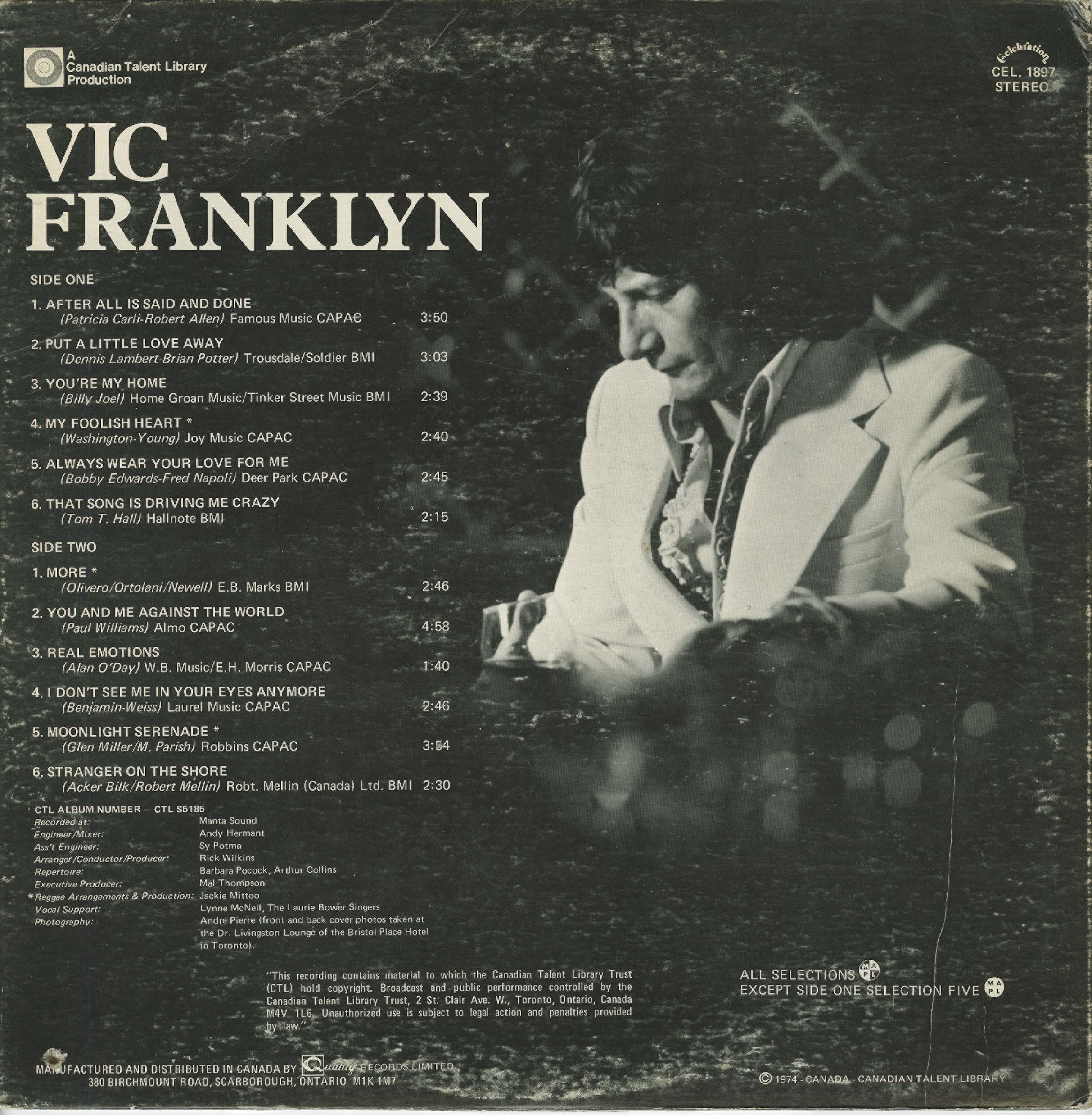 What survives is a compact but distinctive body of work that captures a particular moment in Canadian studio culture. A Welsh-born vocalist in a Toronto room, backed by Rick Wilkins’s charts, Jackie Mittoo’s rhythmic sensibility, and the city’s finest session players, recording albums intended for broadcasters yet built with far more care than their modest budgets would suggest. For those who still search out the original CTL and Birchmount pressings, Vic Franklyn remains less a forgotten lounge singer than a reminder of an era when Canadian music could still embrace late-night elegance, soft rhythm, and a singer who understood the value of understatement.
