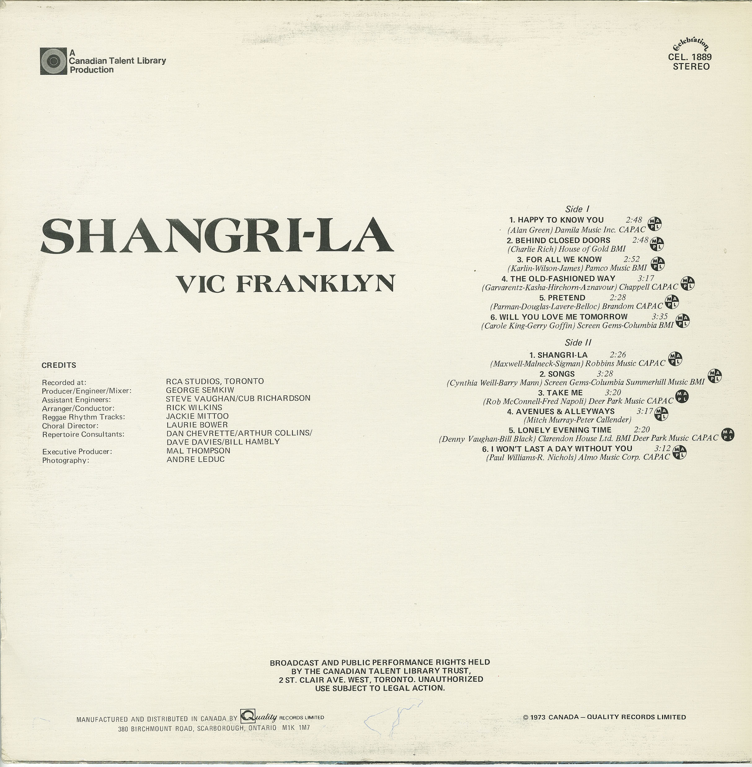 Recorded at RCA Studios, Toronto, Ontario