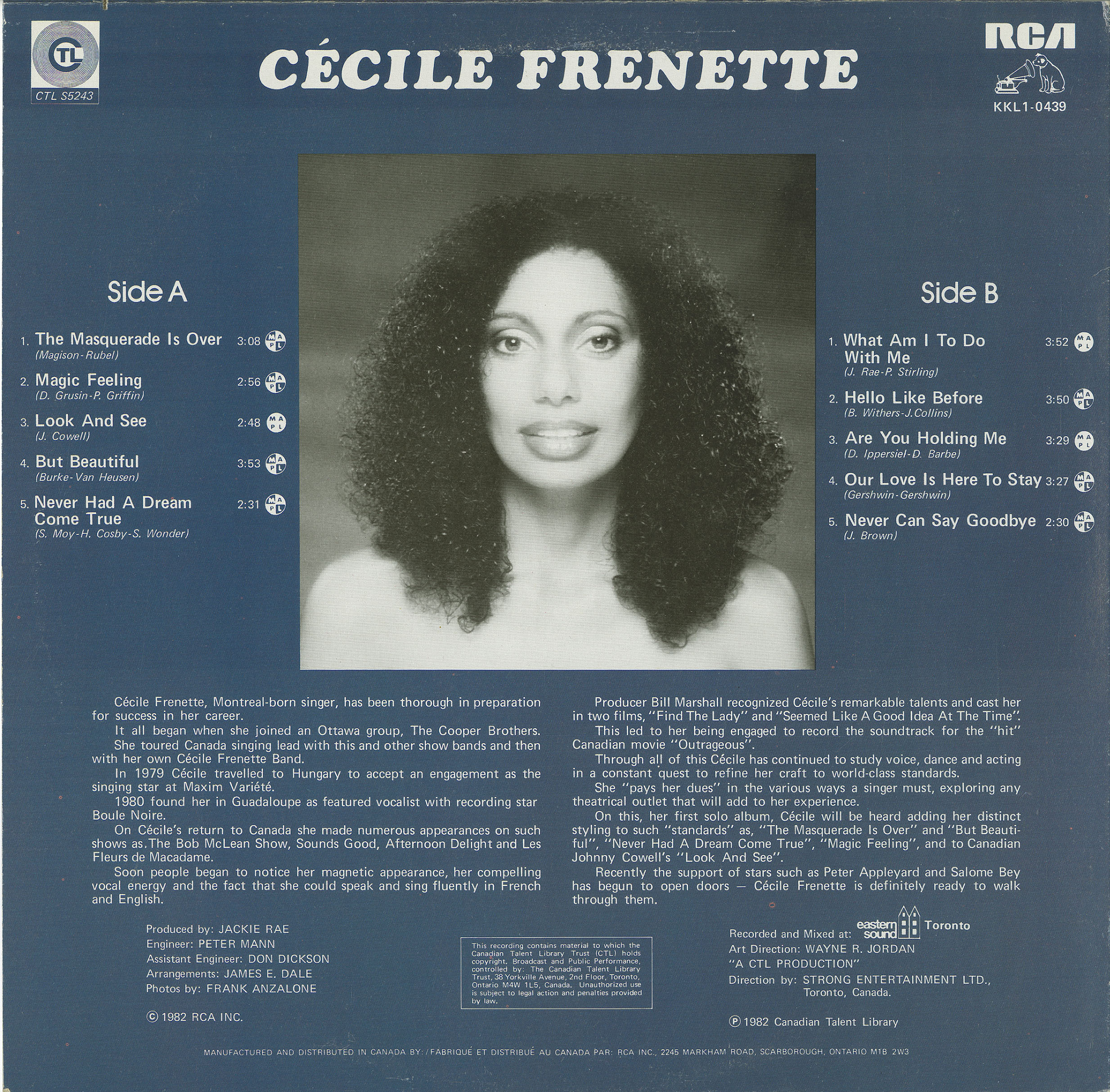 Cécile Frenette, hailing from Montreal, Québec, began her career singing with the Ottawa band The Cooper Brothers in the 1970's. She contributed vocals to two tracks on the soundtrack of 'Outrageous': 'Soon it Will be Christmas' and 'Step Out'. Her self-titled album was released in 1982 under Canadian Talent Library/RCA.