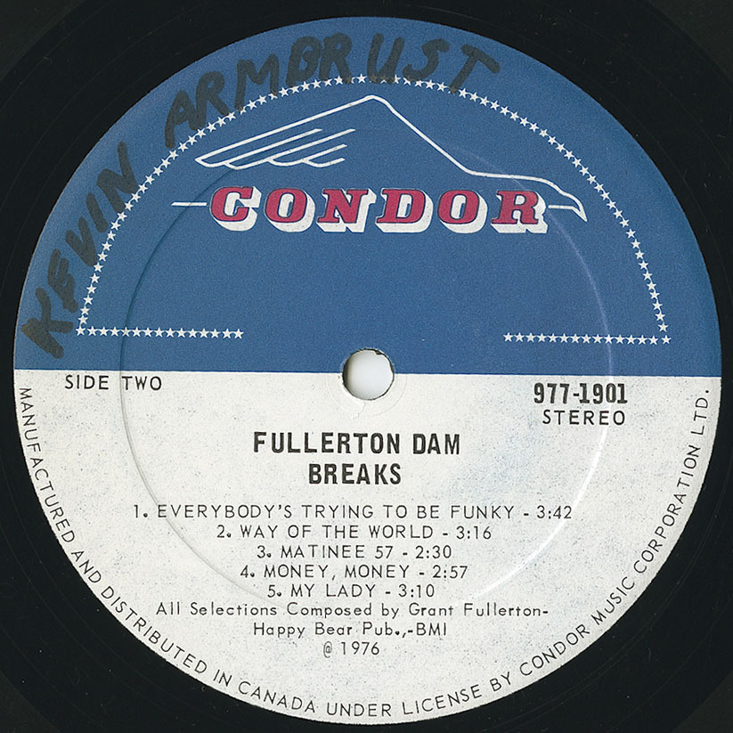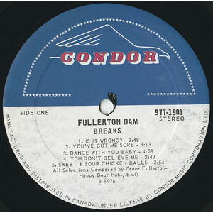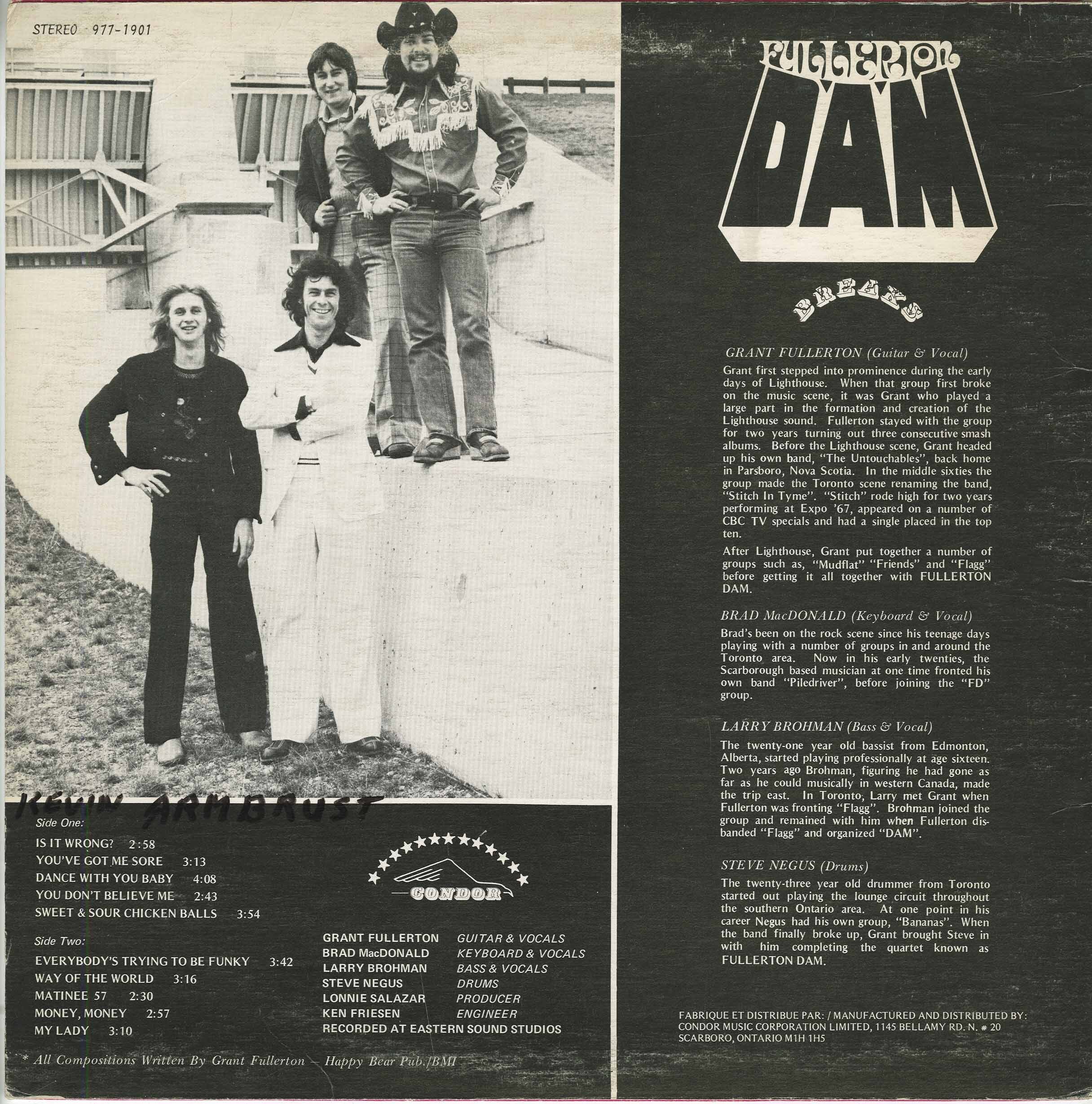 Fullerton Dam formed in 1974. They released four singles on Polydor Records before recording one album with Condor Records. The album came with two different covers. The Fantasy cover sells for about twice as much as the pink cover. In 1977, they formed the Madcats with Grant Fullerton, Bobby Blake, Brad MacDonald, Glen Gratto and John Erdman. They released one album and a few singles. In 1981, they formed The Grant Fullerton Band with Grant Fullerton, Brad MacDonald, Rod Blacker and Steve Campbell, and recorded a mini 4 track album and single.