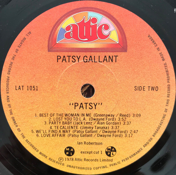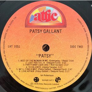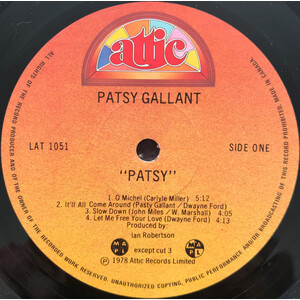 Patsy! is a studio album by Canadian singer/songwriter and producer Patsy Gallant, released in 1978. Highlights from the album include the disco anthem "Oh Michel." In 1978, Gallant earned a Producer of the Year nomination at the Juno Awards, having won Best Female Vocalist the previous two years in a row. For fans of Carol Douglas, Van McCoy, and France Joli.