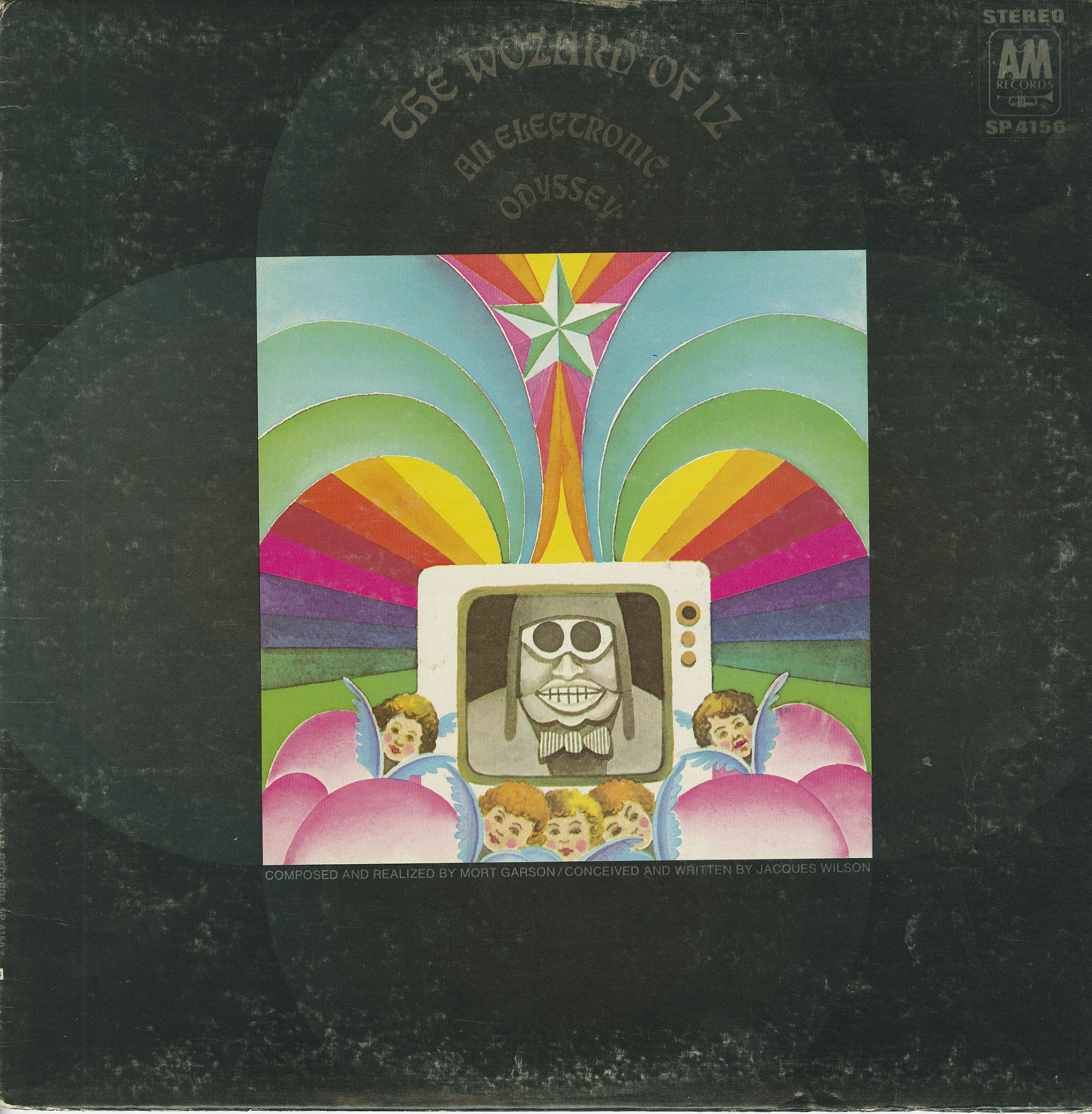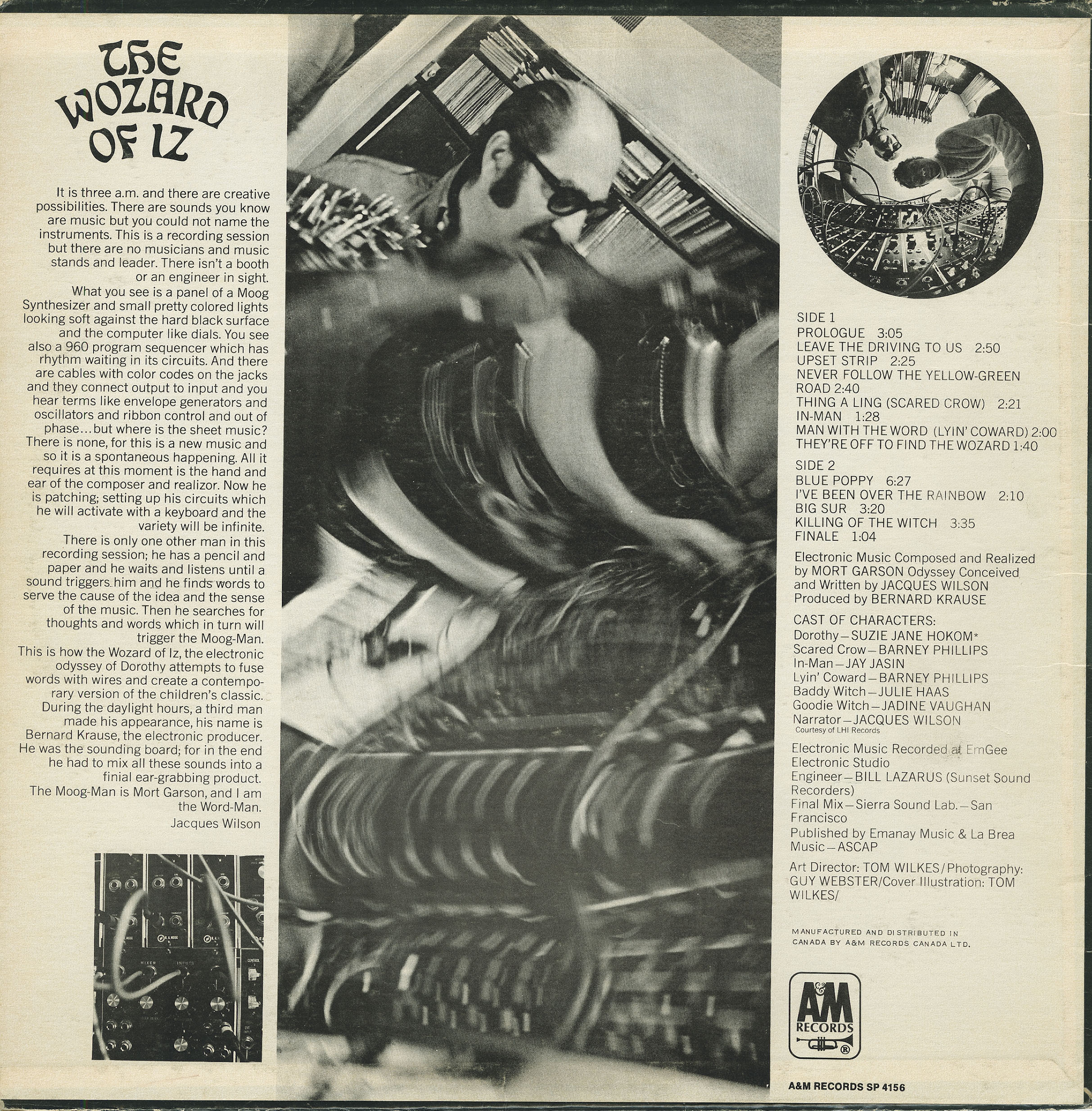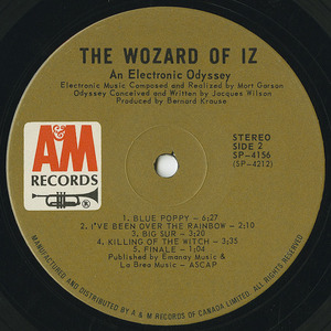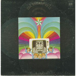 And that's just in the first few minutes. The record goes on and on and on like that. Dorothy meets a bag lady "on a bus" who tries to hand her some pamphlets written by an army general from "Normalville" ... but Dorothy convinces the army general to "...trade his dog tags in for love beads..." and the lady on the bus eventually gets attacked by some "free press" pamphlets, and becomes The Wicked Old Witch in protest. Dorothy eventually decides to "...find the Great Wozard of Iz... because if I find out where the Woz was, I'd find out where it's at!" Then she gets advised by some more witches on busses to leave "Upset Strip" road in search of "the yellow green road" past the land of "surf and muscle tan" where she notes "...everyone has sunburned teeth from smiling so much." The scarecrow she eventually meets is an excessive consumer who buys too many American gas-guzzling cars and who has substituted "things" for "zing" and decides to follow Dorothy on her quest for the Wozard who can perhaps help him "think" instead of "thing." All the while, insanity-inducing electronic sounds bloop, swerve, echo and boom in the background. This LP is a (fractured) MASTERPIECE!
