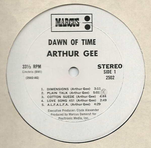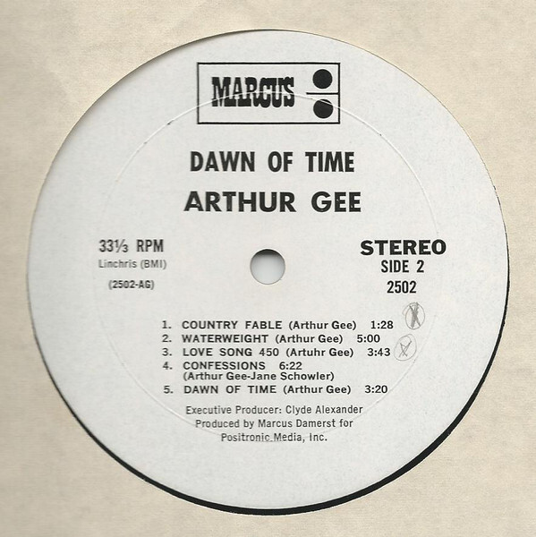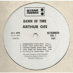 Arthur Gee Album on Marcus ,Small Label / Advance Promo Version or Test pressing of the album that came out on Tumbleweed Records , Looks like the album was provisionally titled ' Dawn Of Time '. , Label Probably named after the producer Marcus Damerst , Album Housed In plain white card sleeve with sticker , which states - Jay K.Hoffman Presentations , 325 East 57th Street , New York , N.Y. 10022 . The Dead wax run -out area's have these Matrix numbers etched - 2502 AG-1 , 15698 / 2502 AG - 2 , 15698 X .
