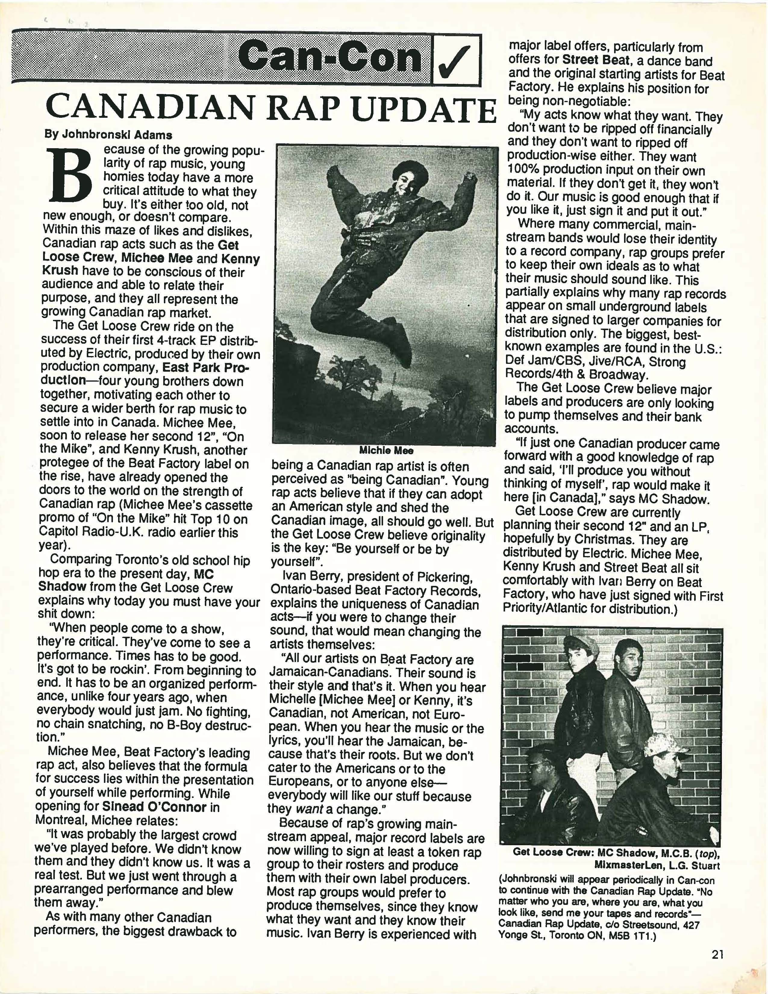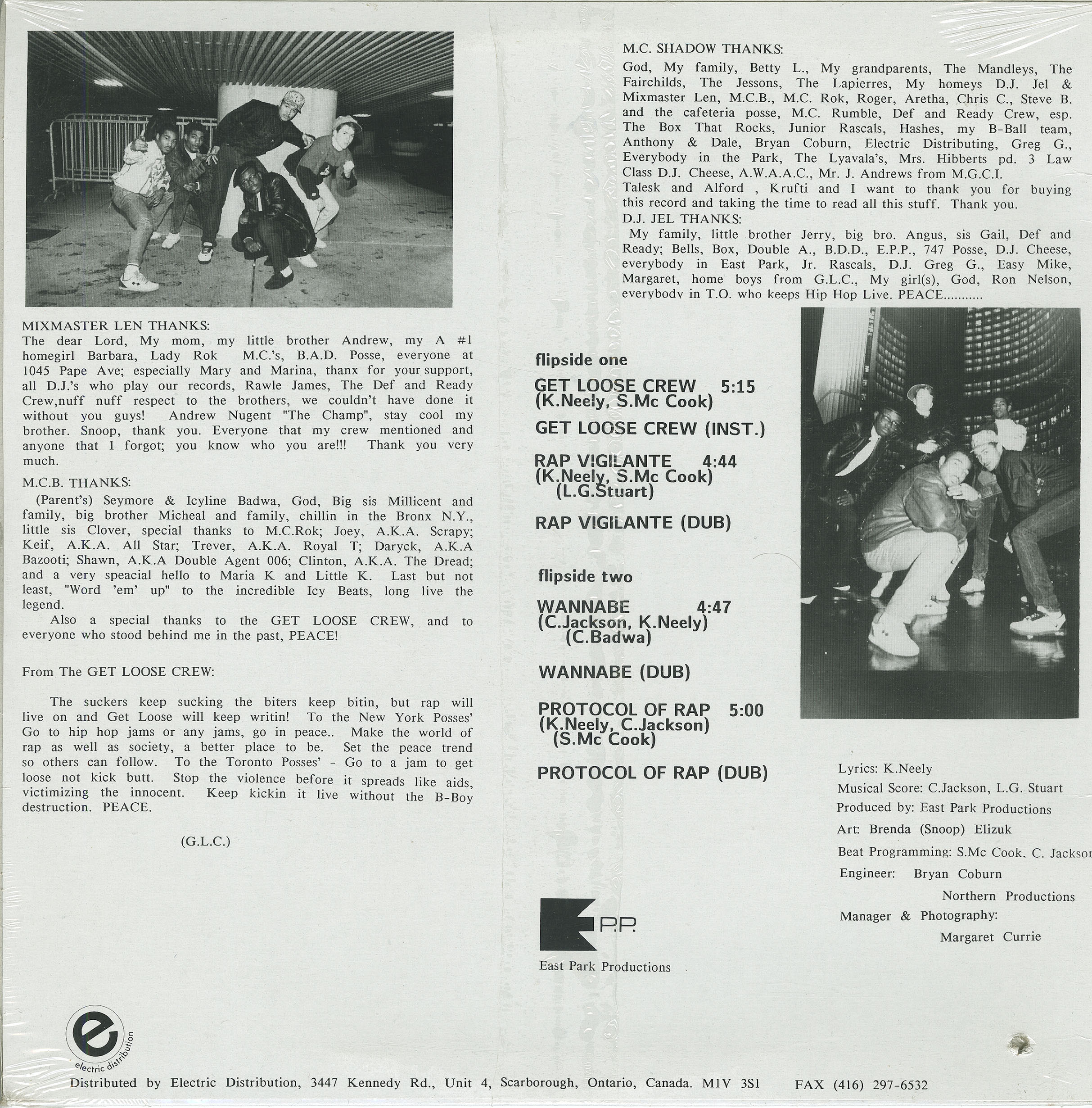 MC Shadow (Kory Neely, pioneer / architect of hip-hop in canada) is a Canadian rapper, actor, producer and author, who achieved fame for being the first white rapper in Canadian music history and second to be recorded on vinyl in the world next to U.S rap artists The Beastie Boys of Def Jam Records. His group Get Loose Crew was the first Canadian rap group to produce and release their independent mini LP and the first to be distributed & sold internationally. Neely also had a brief solo career and worked with a local R&B singer after The Get Loose Crew split ways in 1990. In 2015 he revived his music career with the release of new music and an accompanying three part video project released in both a commercial and short film version dubbed ‘the trilogy’. East Park Productions is an independent record label that was established in 1987 to launch the group's debut album. The album features the charted single "Wannabe" (featuring MC B aka B-kool).