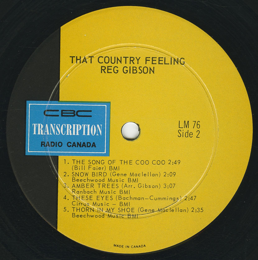 About the songs in this album, Reg says they’re some of his special favourites. The first “The Song of the Marshland”—the words himself and the theme for “One Up and One Down with The Marshland”—he wrote himself. “It’s All Over” is his current single and climbing fast. “My Own Peculiar Way” is a favourite of Willie Nelson’s. “The Song of the Coo Coo”, and “Snow Bird” speaks for itself. So here you have “THAT COUNTRY FEELING”, and are straight Gibson at his best!