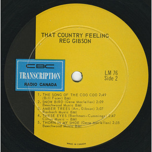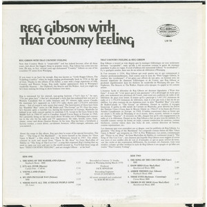 Quant aux chansons de cet album, ce sont les préférées de Reg Gibson. La première “The Song of the Marshland”, il a lui-même écrite, servait de thème musical à son émission télévisée. “It’s All Over” est son dernier disque et il grimpe les palmarès. “My Own Peculiar Way” est une chanson chère à Willie Nelson. “The Song of the Coo Coo”, et “Snow Bird”, se passent de commentaires. Voilà donc “That Country Feeling”, et Reg Gibson à son apogée et dans son meilleur élément!