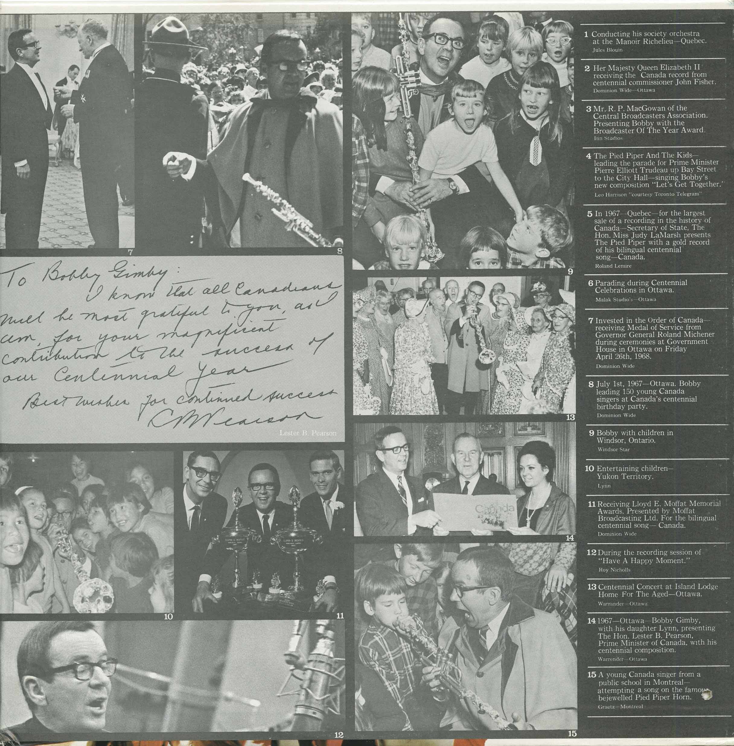 Although uncredited, the vocals on this album were performed by The Craddock Kids, who had their own 1967 Centennial album with Ben McPeek and his Orchestra. Bonnie Craddock recalls, "My mom and dad took us to Ed Sullivan in 1966. We met him and sang a roster of songs, which led to a live show with him. In 1967, Bobby Gimby wrote 'C-A-N-A-D-A,' and we were chosen to sing it. For a long time, it was believed that many kids sang it, but the truth is, it was us - overdubbed. We even recorded the French version along with another French Canadian girl. This led to numerous Exhibition shows where we performed six days a week, several times a day." The gatefold jacket of the album includes 15 historic photos, providing a glimpse into Gimby’s remarkable journey.
