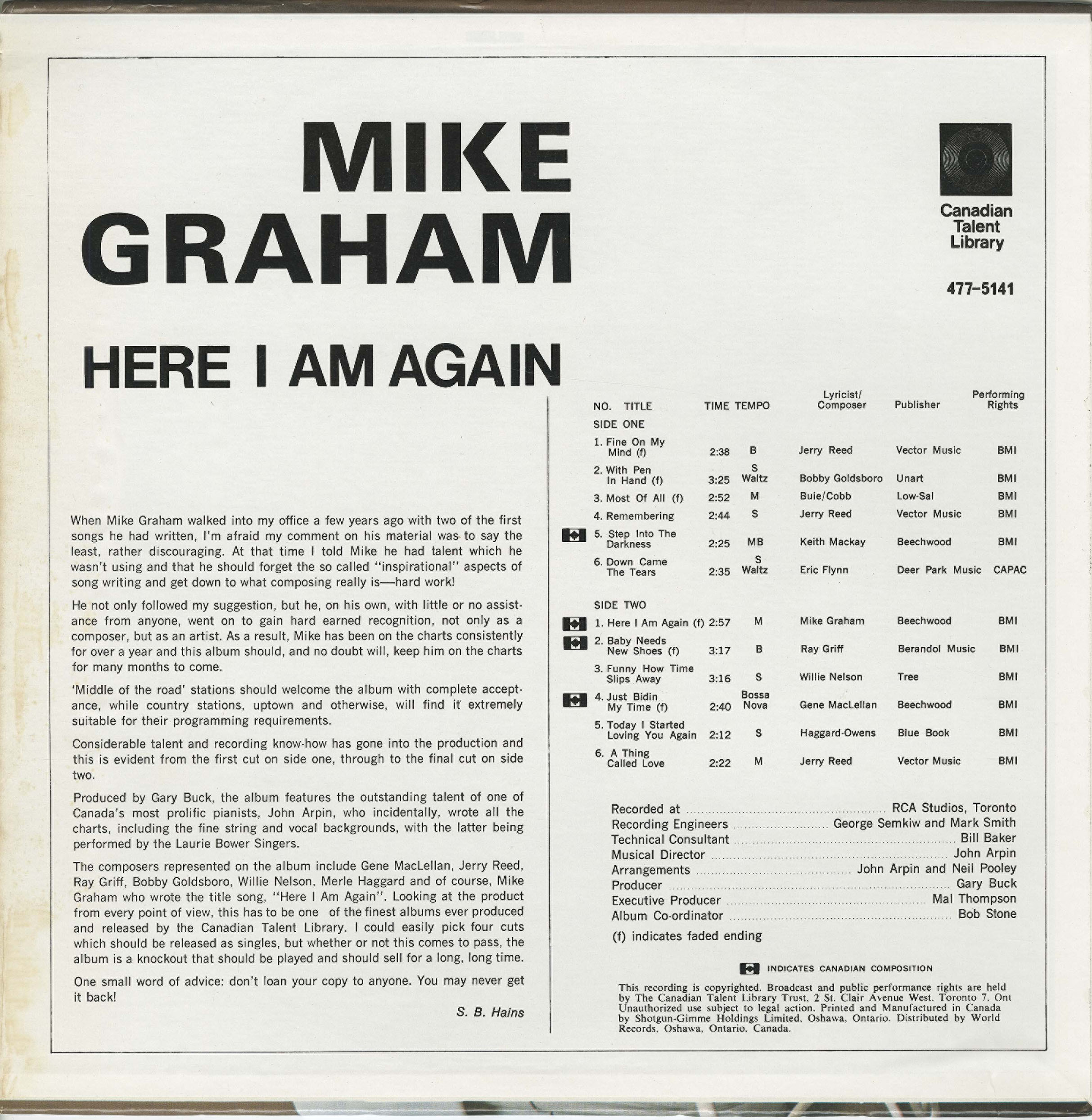 The compositions presented on the album include Gene MacLellan, Jerry Reed, Ray Griff, Bobby Goldsboro, Willie Nelson, as well as three original Mike Graham pieces. Two of the songs "Slip Away" and "Here I Am Again," were produced for release only by the Canadian Talent Library. "Here I Am Again" by Mike Graham will be the vital, this has to be one of the proudest productions ever presented for your listening pleasure. The blend of a fine mixture of songs, long as the album is a knockout that should be played and should sit for a long last.