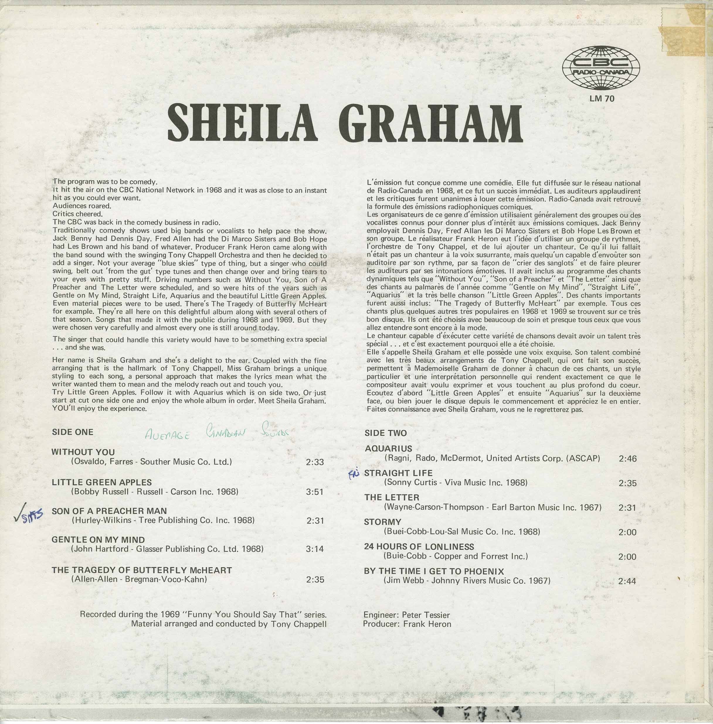 Sheila Graham began her career as a college band singer. Her star rose quickly and she went to larger and more sophisticated bands such as those led by Blake Sewell and Johnny Holmes. The Holmes orchestra was a breeding ground for Canadian jazz greats like Oscar Peterson and Maynard Ferguson. Fame for Graham came by way of radio, first on CJAD in Montreal and later for the CBC, where she worked on the network's variety and dramatic shows. A high point of her career was when she had her own program Sheila Sings.