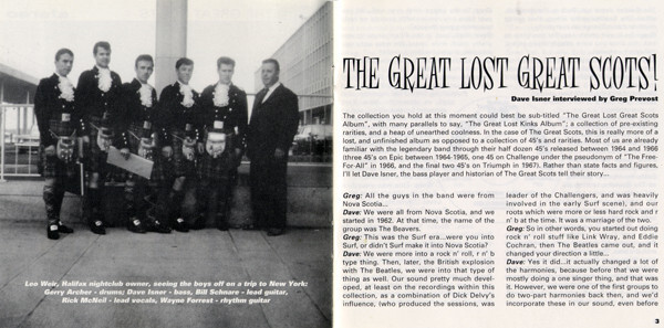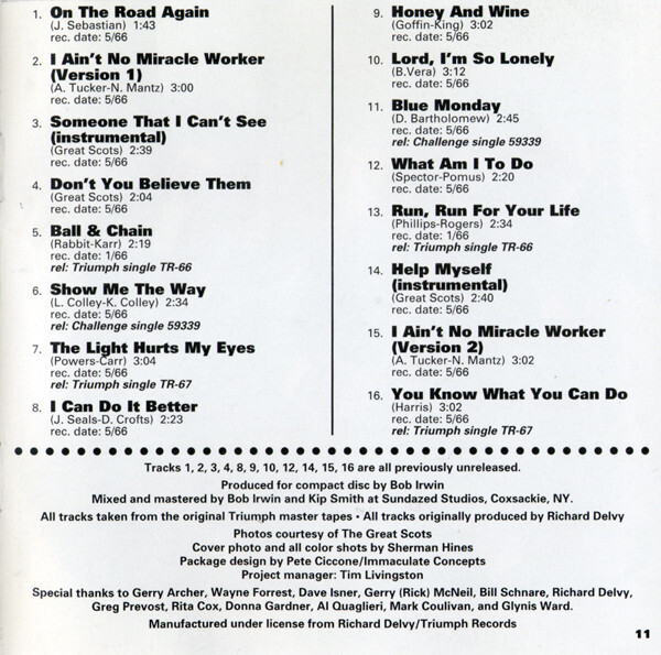 Evolving out of The Beavers, who issued a 45 on London in 1963, this Halifax, Nova Scotia, outfit cut some wild garage punkers. By their final 45 they'd veered off towards David Clayton-Thomas territory - heavy melodramatic macho-man pop. The 'A' sides to their first two 45s were later included on Nightmares From The Underworld, Vol. 1, That's My Girl has also resurfaced on Open Up Yer Door, Vol. 2 and Ball And Chain on The Garage Zone, Vol. 3. Give Me Lovin' was a massive Canadian hit, peaking at No. 11 on 25th October 1965. Both sides of their first two 45s can also be heard on The Great Scots.... Arrive! album, along with a series of previously unreleased recordings from 1965. The 1997 Sundazed album The Great Lost, Great Scots album includes both sides of their last three 45s and eight previously unreleased cuts, including covers of John Sebastian's On The Road Again, an excellent cover of Tucker-Mantz's I Ain't No Miracle Worker, renditions of Seals and Croft's I Can Do It Better, Goffin-King's Honey And Wine, Billy Vera's Lord, I'm So Lonely and the Spector-Pomus number What Am I To Do. The collection is rounded off by two band originals - an instrumental Someone That I Can't See and Don't You Believe Them. There is no duplication of material between this and The Great Scots.... Arrive! album so it's worth getting both! It seems the album they were working on from which much of the material on the Sundazed album was never released at the time because Dave Isner got drafted. Still, although they never made the big time they remain good friends. They all live in fairly close proximity to one another and have a big reunion every Labor day.