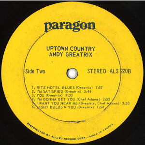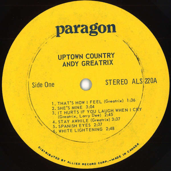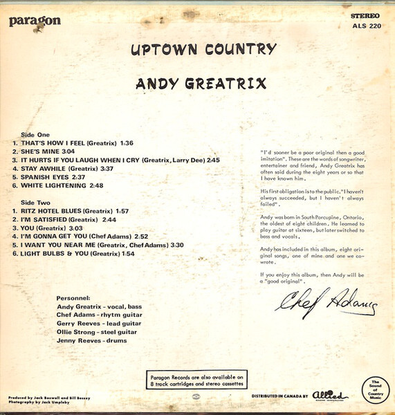 Country artist from South Porcupine, Ontario who was signed to Paragon Records in the mid-1960s for the album ‘Uptown Country.’ It would feature Chef Adams’ band. Greatrix would return the favour by appearing on Chef Adams’ album ‘Singer/Songwriter’ in 1969. Greatrix would later assemble the Greatrix Freedom Band for several more releases on Paragon followed by The Andy Greatrix Harmony Band who signed to Periwinkle and released one album. In the 1990’s Greatrix would do session work including drums and bass for Calvin Vollrath.