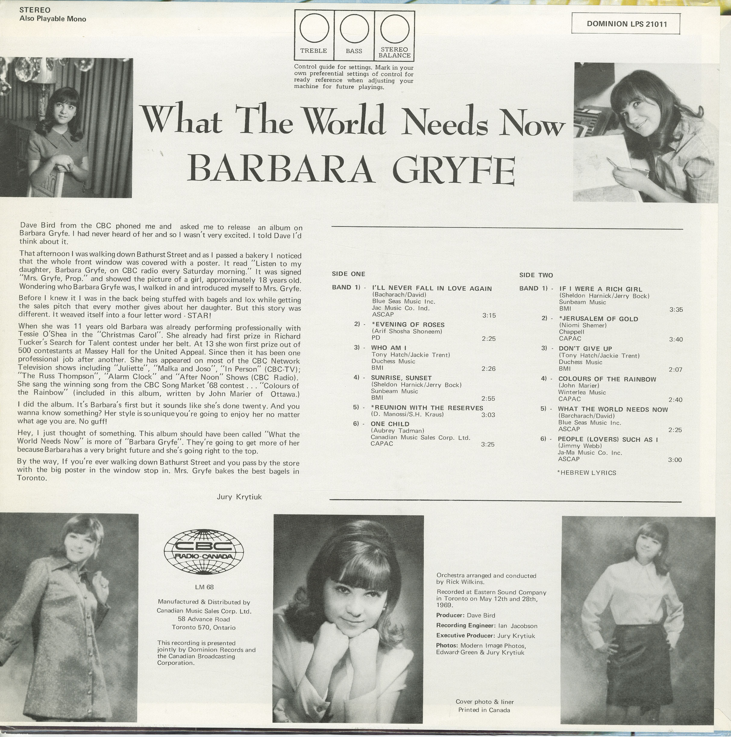 The following year, still only 17, Gryfe recorded her debut album What the World Needs Now, released jointly on CBC and Dominion. Produced by Dave Bird and engineered by Ian Jacobson, the album featured rich orchestral arrangements by Rick Wilkins. What the World Needs Now offered Gryfe’s interpretations of soft-pop standards by Bacharach & David, Jimmy Webb, Jackie Trent & Tony Hatch, and others, along with selections in Hebrew — a nod to her cultural roots. While critics noted that her voice was more soothing than sensational, the album’s lush arrangements and heartfelt tone earned it cult status among collectors, prompting a 2018 reissue on 180-gram vinyl by Majikbus Entertainment, along with a co-operative full feature at CitizenFreak.com.
