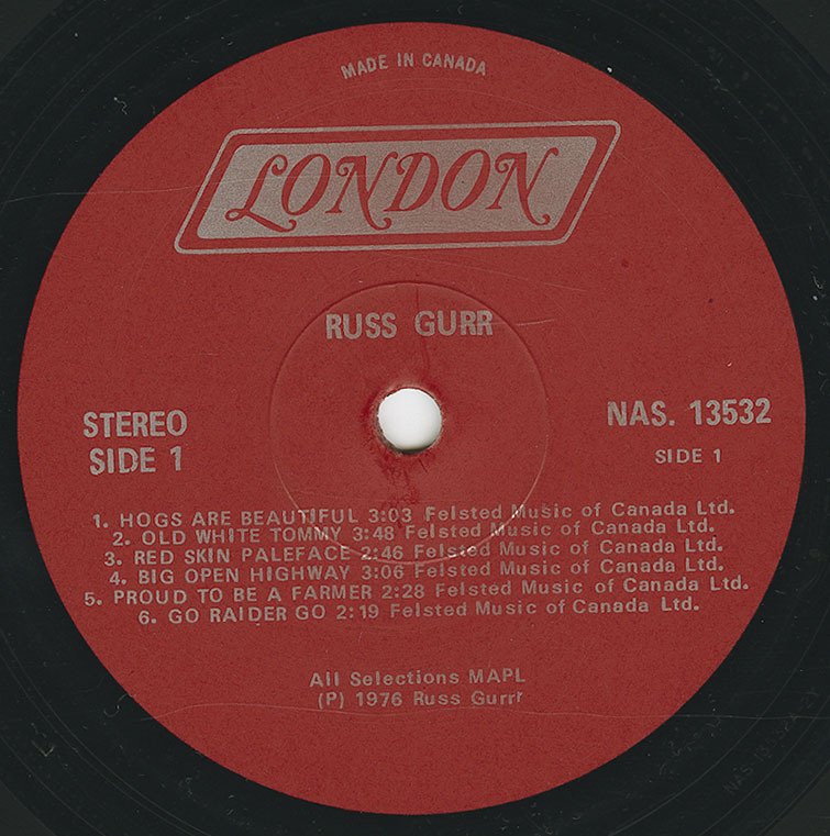 Russ Gurr, The Singing Farmer, hails from Arrow River, Manitoba and had a 1500 acre farm operation just outside Brandon, Manitoba. He recorded three albums in the 1970's. "Hogs are Beautiful" was his third album, released in 1976 on London NAS 13532. He also released "Federal Grain Train" on Rodeo RLP 7119 and "On Tour With Russ Gurr" on London NAS 13527 in 1973. R.P.M. magazine had hailed Russ Gurr as possibly the greatest Canadian country singer yet discovered. Russ Gurr sung Canadian patriotic songs about famous Canadians such as Sir John A. MacDonald, Marlene Jackson, John Diefenbaker, Louis Riel, and Tom Lamb. He sung of the Canadian prairies like Manitoba, Saskatchewan, Brandon, Dauphin, Prince Albert.