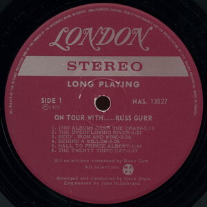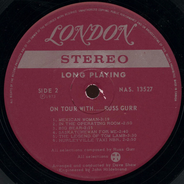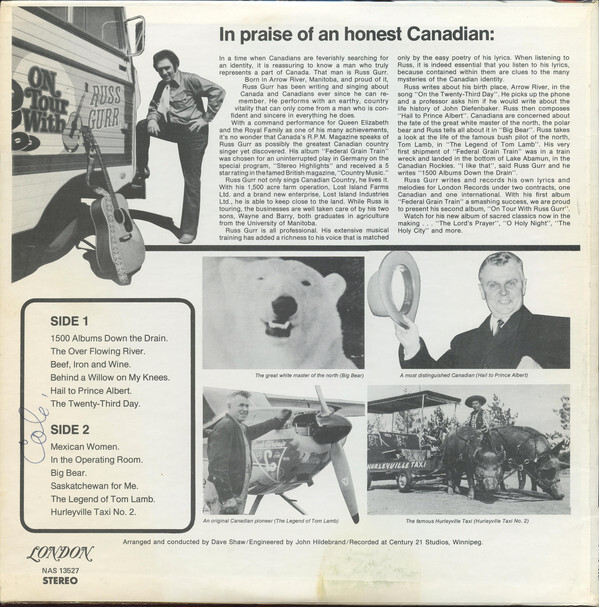 In a time when Canadians are feverishly searching for an identity, it is reassuring to know a man who truly represents a part of Canada. That man is Russ Gurr. Born in Arrow River, Manitoba, and proud of it, Russ Gurr has been writing and singing about Canada and Canadians ever since he can remember. He performs with an earth, country vitality that can only come from a man who is confident and sincere in everything he does. With a command performance for Queen Elizabeth and he Royal Family as one of his many achievements, it's no wonder that Canada's R.P.M Magazine speaks of Russ Gurr as possibly the greatest Canadian country singer yet discovered. His album, "Federal Grain Train" was chosen for an uninterrupted play in Germany on the special program, "Stereo Highlights" and received a 5 star rating in the famed British magazine, "Country Music." Russ Gurr not only sings Canadian Country, he lives it. With his 1500 acre farm operation, Lost Island Farms, Ltd., he is able to keep close to the land. While Russ is touring, the businesses are well taken care of by his two sons, Wayne and Barry, both graduates in agriculture from the University of Manitoba. Russ Gurr is all professional. His extensive musical training has added a richness to his voice that is matched only by the easy poetry of his lyrics. When listening to Russ, it is indeed essential that you listen to his lyrics, because contained within them are clues to the many mysteries of the Canadian identity. Russ writes about his birth place, Arrow River, in the song "On the Twenty-Third Day." He picks up the phone and professor asks him if he would write about the life history of John Diefenbaker. Russ then composes "Hail to Prince Albert." Canadians are concerned about the fate of the great white master of the north, the polar bear and Russ tells all about it in "Big Bear". Russ takes a look at the life of the famous bush pilot of the north, Tom Lamb, in "The Legend of Tom Lamb". His very first shipment of "Federal Grain Train" was in a train wreck and landed in the bottom of Lake Abamun, in the Canadian Rockies. "I like that", said Russ Gurr and he writes "1500 Albums Down the Drain." Russ Gurr writes and records his own lyrics and melodies for London Records under two contracts, one Canadian and one International. With his first album "Federal Grain Train" a smashing success, we are proud to present his second album, "On Tour With Russ Gurr." Watch for his new album of sacred classics now in the making... "The Lord's Prayer," "O Holy Night," "The Holy City" and more. (Arranged and conducted by Dave Shaw / Engineered by John Hildebrand / Recorded at Century 21 Studios, Winnipeg.)