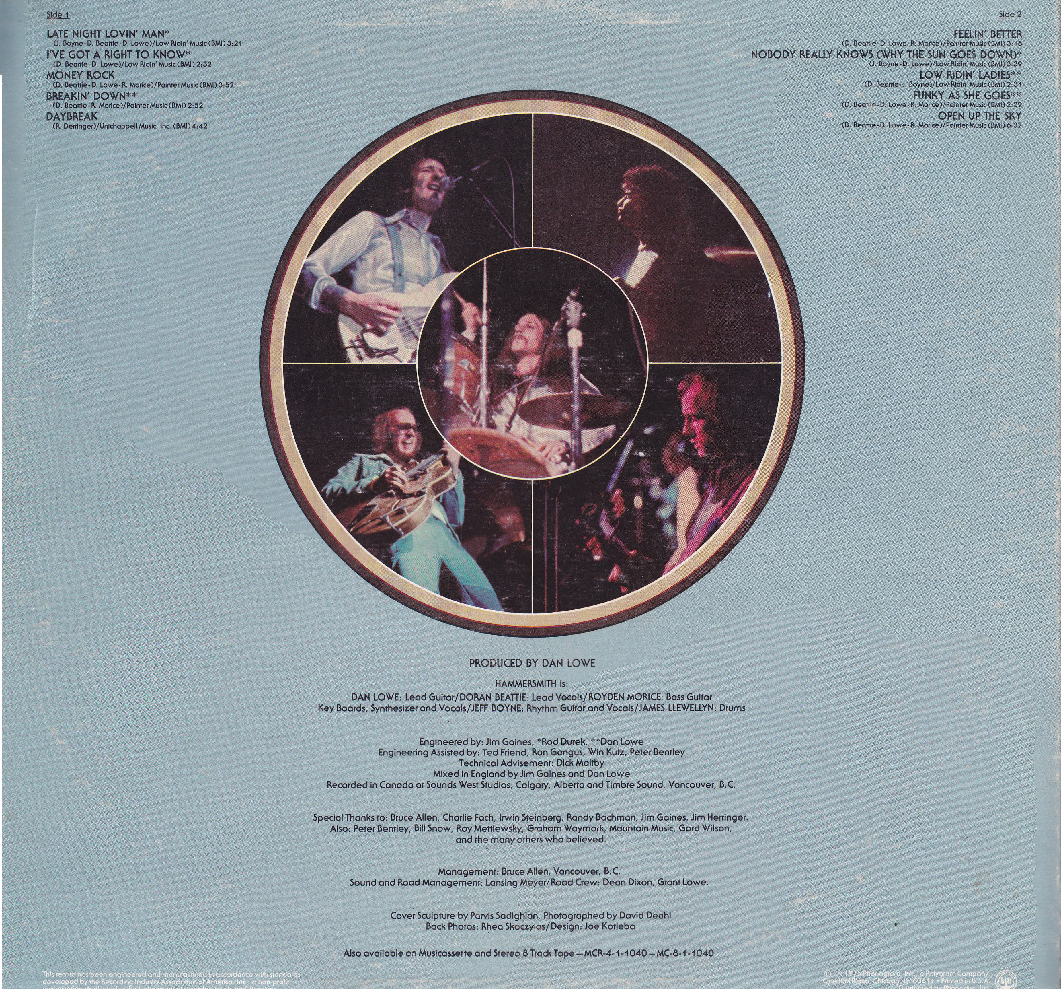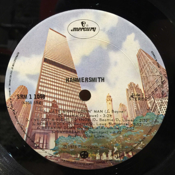 By 1974, management changes and lineup shifts brought them back to Canada. With Bruce Allen (BTO’s manager) taking the helm, Lowe, Beattie, and Morice rebranded the group as Hammersmith, signing to Mercury Records. The lineup now included guitarist Jeff Boyne and drummer Jim Llewellyn. Their 1975 debut album Hammersmith featured the singles Late Night Lovin’ Man and Funky As She Goes, showcasing their blend of heavy riffs and melodic hooks. The album saw them tour extensively, including opening stints with Rod Stewart & The Faces, Kansas, Spirit, and multiple dates with Jethro Tull — with whom the band developed a close bond.