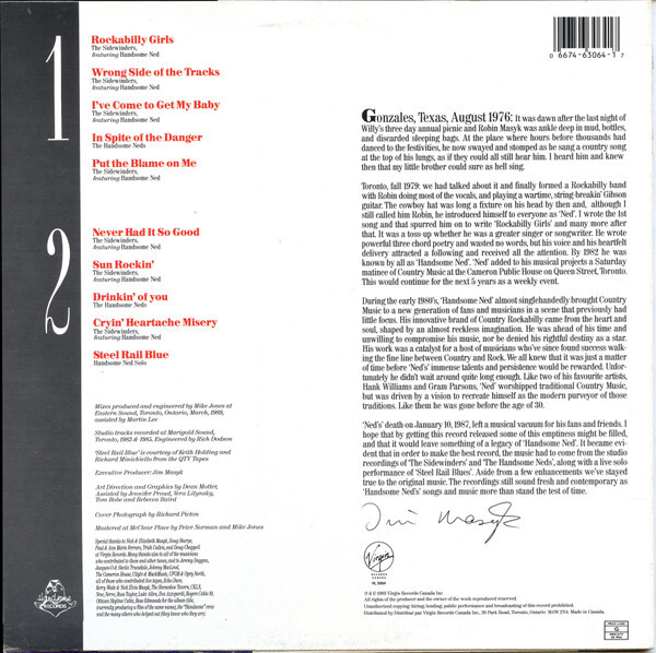 “Ned’s death on January 10, 1987, left a musical vacuum for his fans and friends. I hope that by getting this record released some of this emptiness might be filled, and that it would leave something of a legacy of Handsome Ned. It became evident that in order to make the best record, the music had to come from the studio recordings of The Sidewinders and The Handsome Neds, along with a live solo performance of ‘Steel Rail Blues’. Aside from a few enhancements we’ve stayed true to the original music. The recordings still sound fresh and contemporary as ‘Handsome Ned’s’ songs and music more than stand the test of time.”