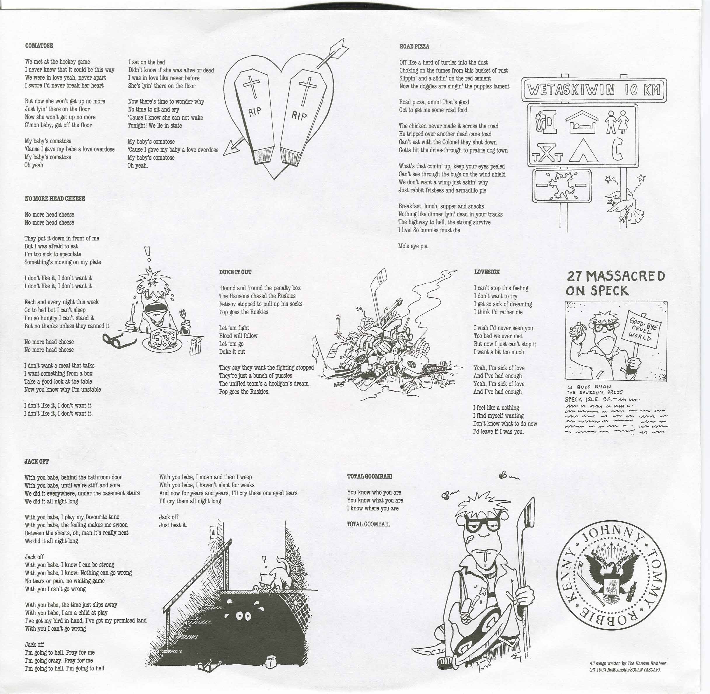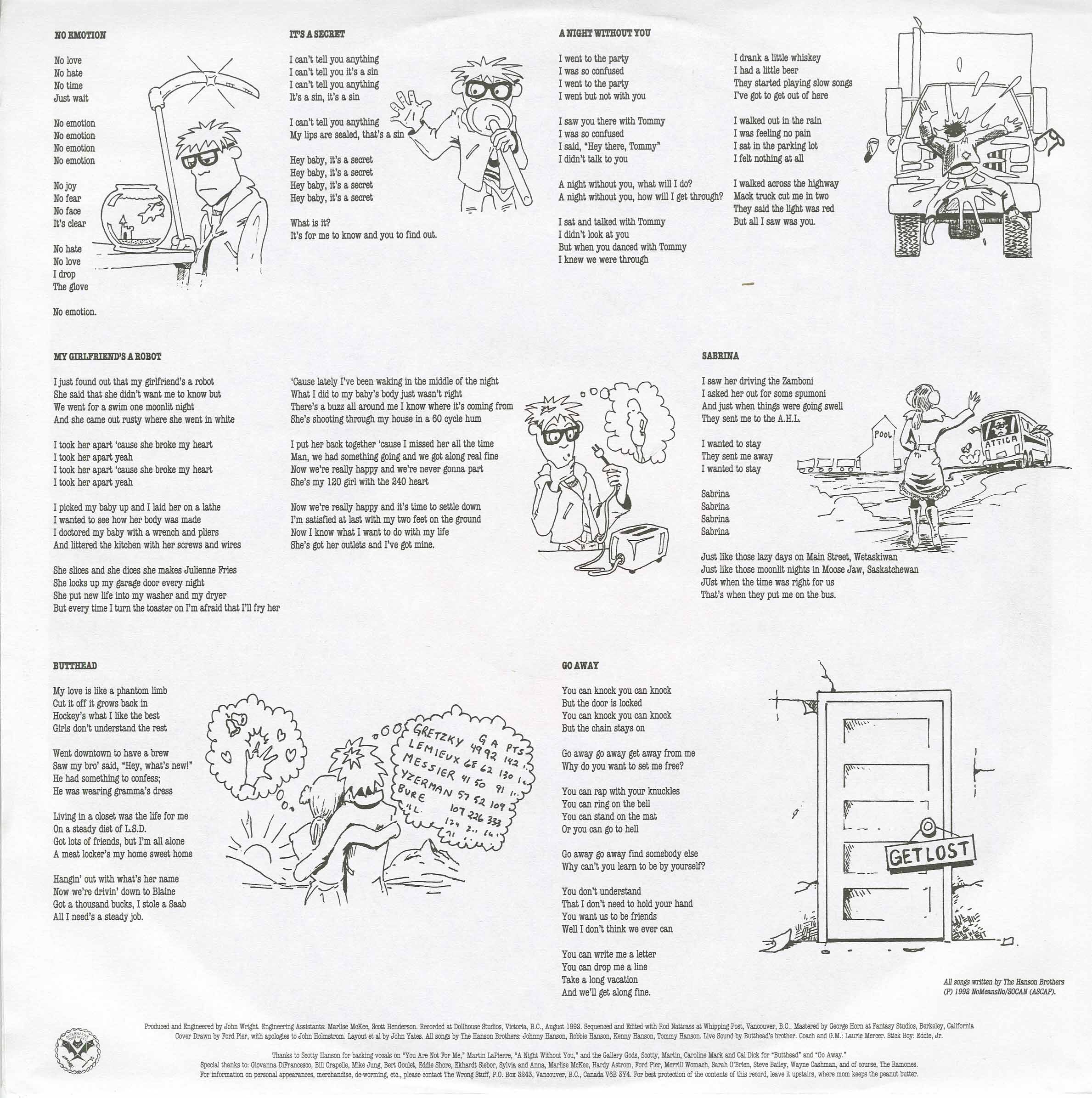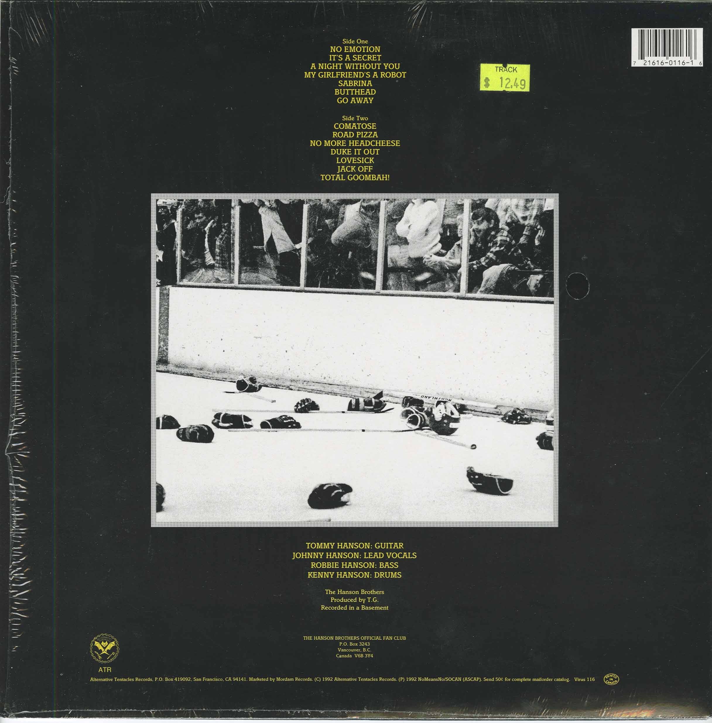 It's no secret that the Hanson Brothers are essentially a side project of NoMeansNo's Wright brothers and Tom Holliston (know as Tommy, Johnny and Robbie Hanson here), paying tribute to the band that inspired them to play punk rock as well as allowing their hockey fan side to have a part of their music. Several songs have hockey references and the song "Duke It Out" is about the Unified Team from the former Soviet Union. What the Hanson Bros. do throughout this excellent album is nothing but refine the formula the Ramones created. However, while the Ramones were limited by their own talent shortcomings, the Hanson Bros. are not and in fact play this simple three chord punk with marvelous skill, adding a layer of depth where many bands are unable to tread. The songs are simple but have so much energy that you can't help but pogo along with them. The second side of this album is nothing more and nothing less than a juggernaut of intense adrenaline charged fun punk being played at its finest. The lyrics are pretty silly, as "No More Headcheese" will attest, but they're delivered well by Johnny Hanson. You will be forced to sing along, under threat of a hockey stick being delivered at full force to your noggin. The album is terribly infectious and simply provides a healthy dose of good, violent fun..