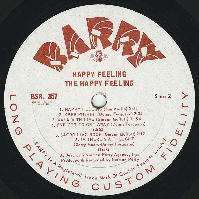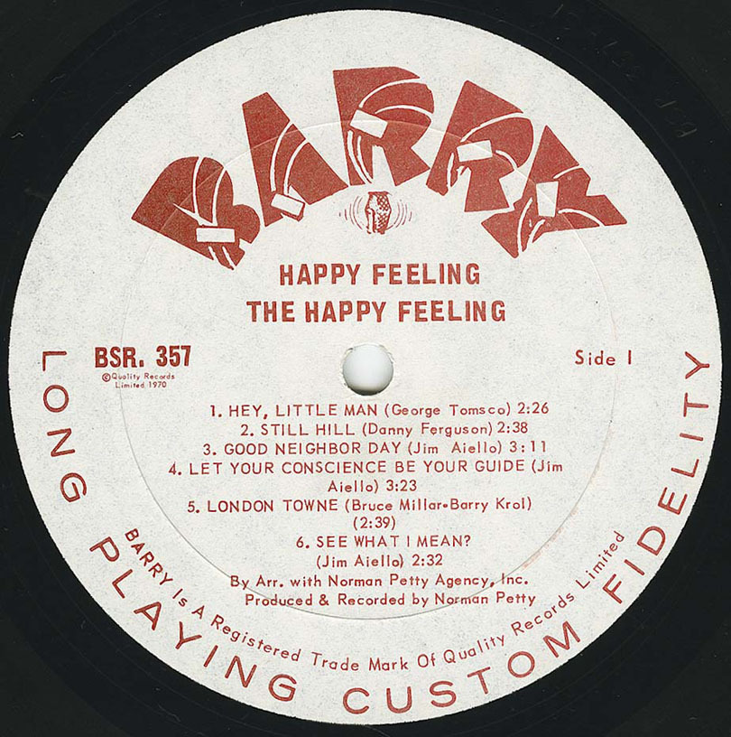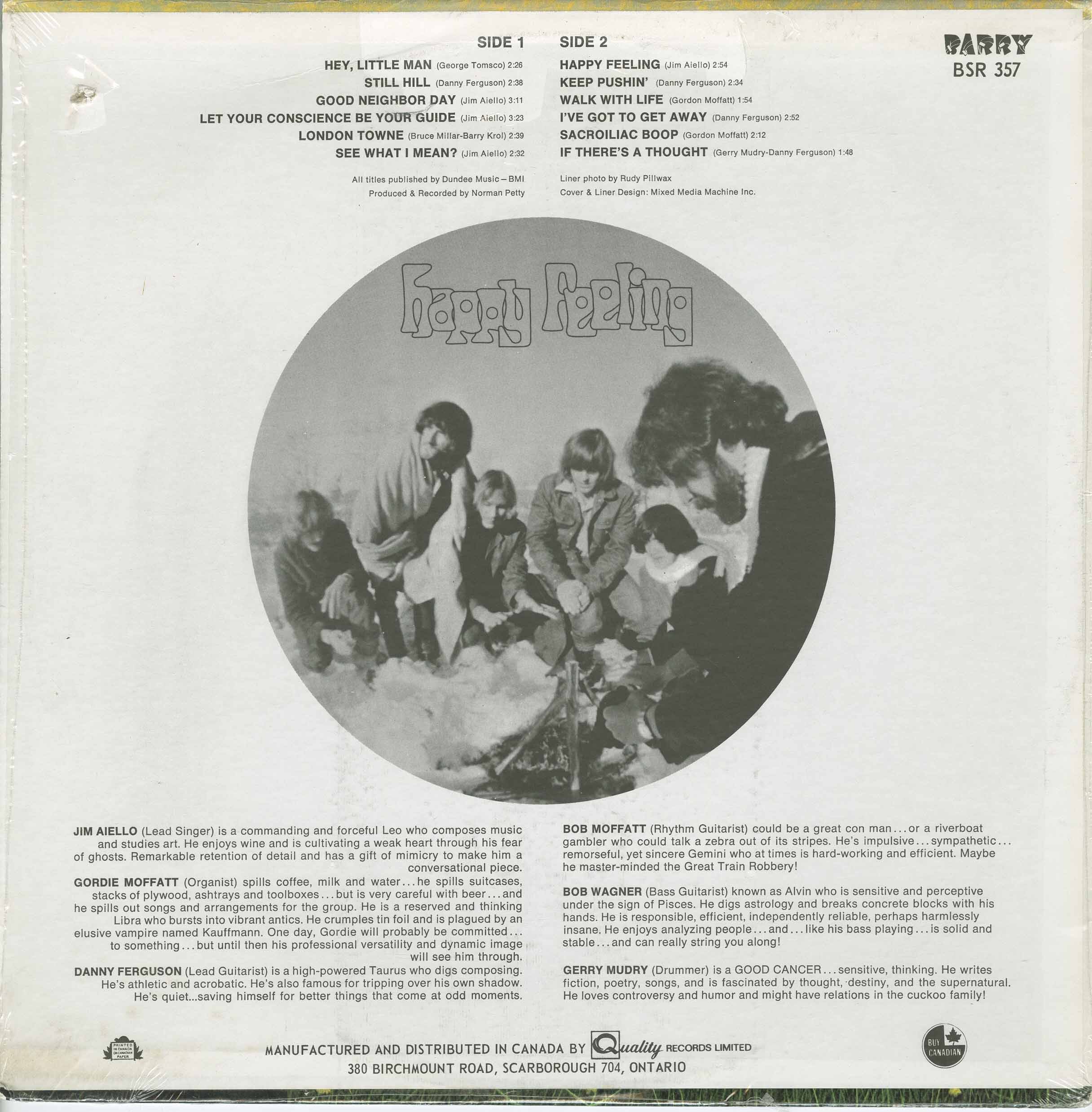 This Calgary-based band would probably be even further buried in the sands of time if it weren't for the fact that they were produced by the great Norman Petty down at his famous studios in Clovis, New Mexico. In fact, few people realize that the man responsible for records by Roy Orbison, Waylon Jennings and Buddy Holly also had an Alberta connection, recording hits for the likes of Wes Dakus and the Rebels, Barry Allen, the Gainsborough Gallery and of course the Happy Feeling.