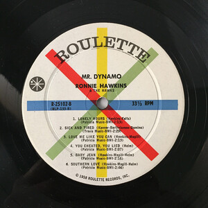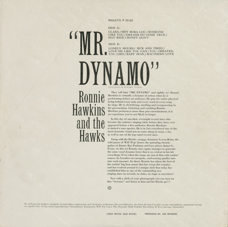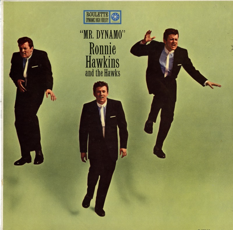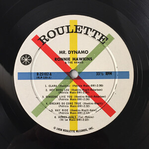 Some of the song-writing credits on Mr. Dynamo are just a result of Roulette Records' ways of doing business in this period. E.g. the track "You Cheated (You Lied)" was actually written by Don Burch, and had been a US# 12 hit for The Shields in the fall of 1958. The songs "Hayride" and "Baby Jean" are probably Hawks compositions, though. They appear as slightly different takes on The Roulette Years, suggesting that they were originals that hadn't been finished yet, rather than covers adapted by the Hawks. Even if Ronnie Hawkins respected Robbie's songwriting skills enough to take him to the Brill Building later, Robertson may not have written the songs he was co-credited for on this album either.