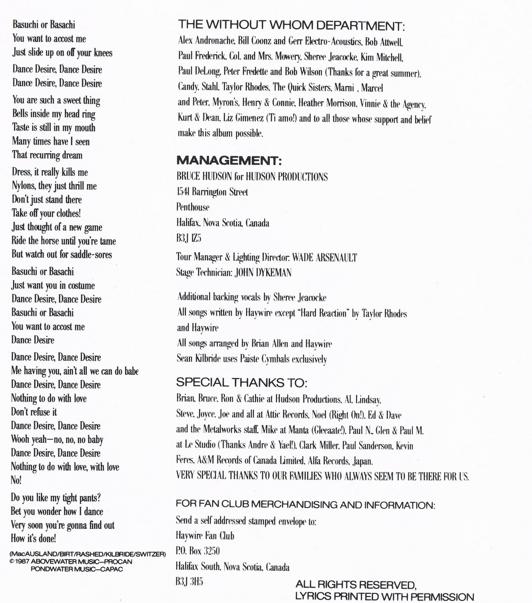 Don't Just Stand There is a studio album by Canadian rock band Haywire, released in 1987. The album went platinum in Canada, led by the Top 10 hit "Dance Desire." The band toured alongside Helix, Honeymoon Suite, and Kim Mitchell.