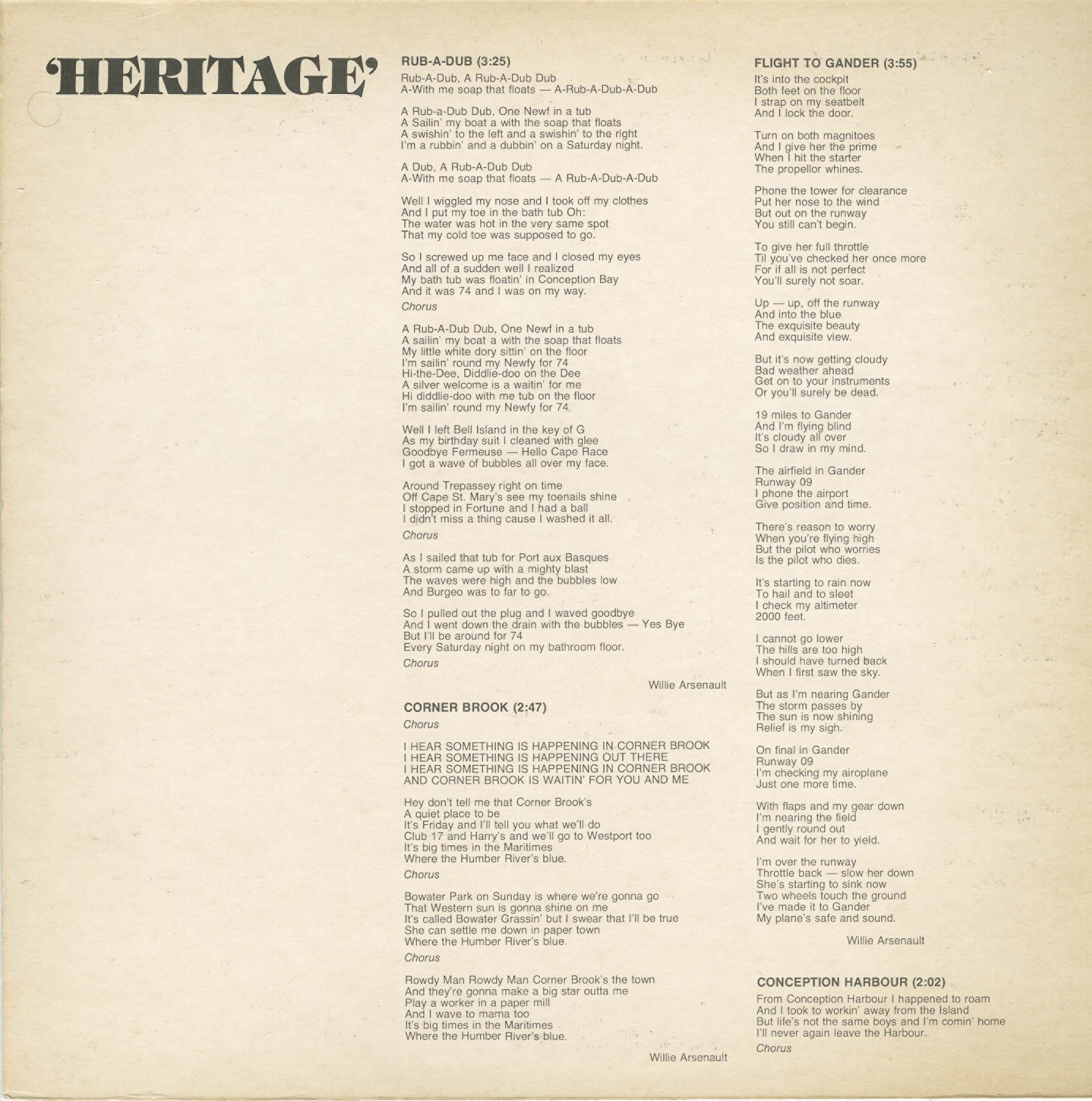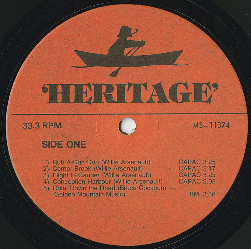 Heritage released this fabulous example of Newfandlandia in 1975 on their own private label, Heritage H.T. 0100. It was recorded by Jack Windsor at Echo Recording Studio, St. John's, Newfoundland. The album features nine compositions, all written by Willie Arsenault.