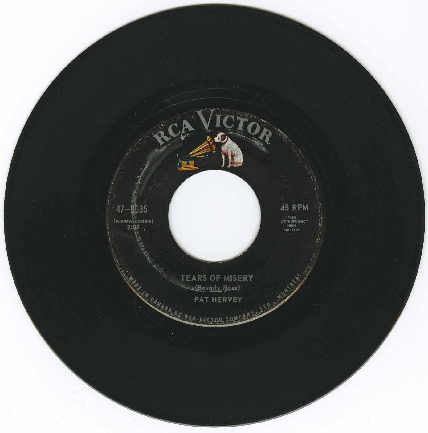 Tears of Misery was produced by Chet Atkins and won a pop spotlight pick for Pat Hervey in the U.S. Billboard publication. It was a hit record in Canada reaching number 11 on the CHUM chart in Toronto and even higher in some other Canadian cities like Calgary where it rose to number 2 ! Pat does a great job of Brother, Can You Spare A Dime which also appeared on the compilation album called Make-Believe Ballroom Time, Music of the 30's on the RCA Camden label.
