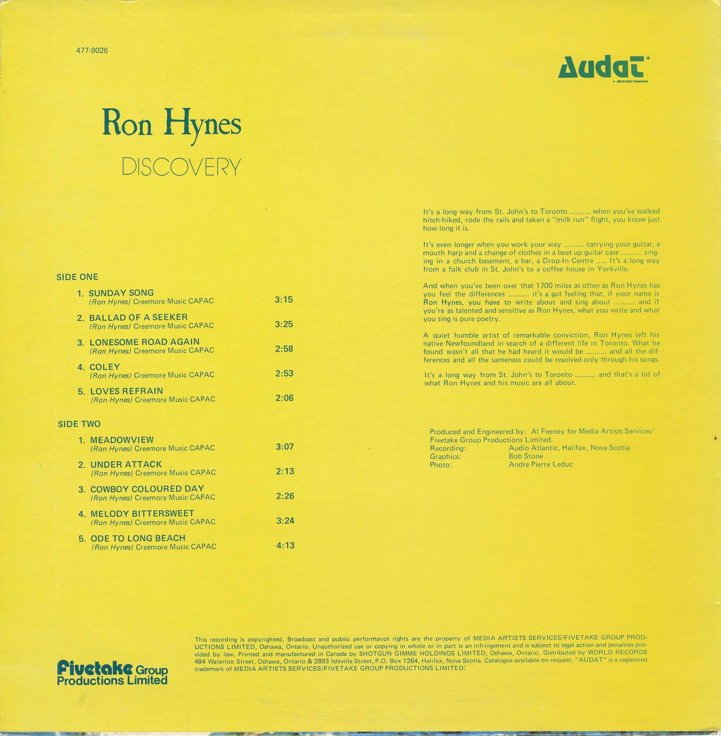 His debut album, Discovery, released in 1972, was the first album composed of totally original content by a Newfoundland artist. Hynes is a seven-time East Coast Music Awards winner, and past Juno and Canadian Country Music Awards nominee.