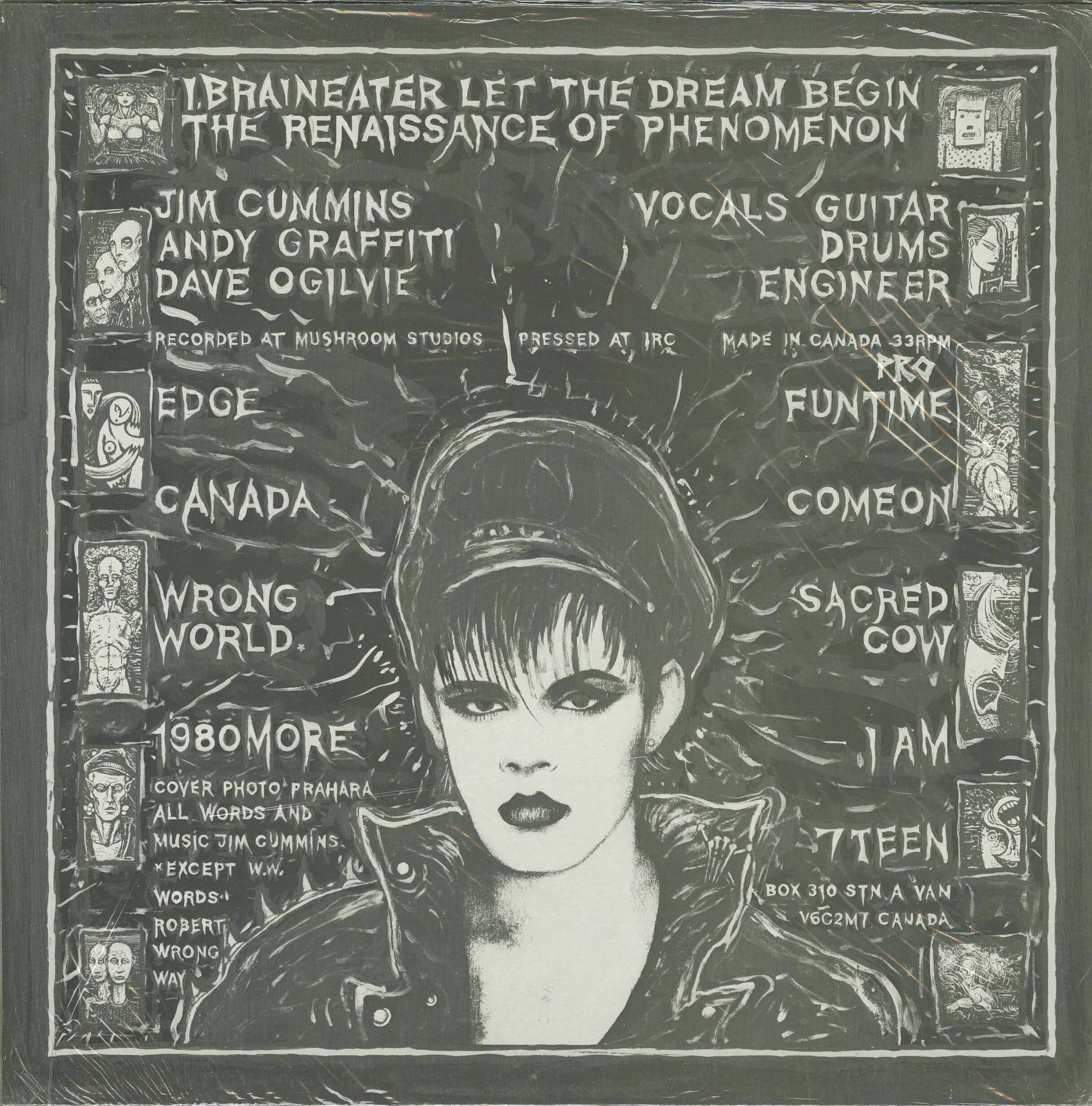 The first musical incarnation appeared in 1979 under the name Braineater (often referred to retrospectively as The Braineaters), an all-star Vancouver ensemble that Cummins assembled for performances and recordings. This debut lineup included scene heavyweights Buck Cherry of the Modernettes and Art Bergmann of the K-Tels/Young Canadians, musicians whose involvement instantly tied the project to Vancouver’s explosive punk moment. Their debut EP—issued as a seven-inch and packaged in a colour silkscreened manila envelope—was as much an art object as a record, a sharp jolt of punk minimalism wrapped in Cummins’ signature visual style. The sleeve read “I, Braineater,” though the group was known as Braineaters at the time, setting the stage for the persona to eventually eclipse the band entirely.