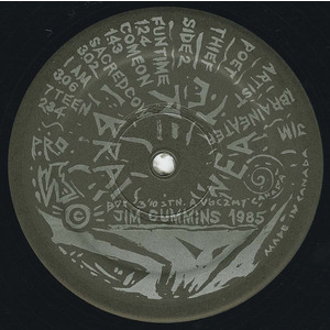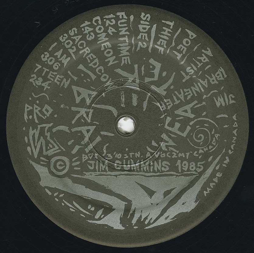 The recordings from these shifting ensembles capture the rapid evolution of the project. The 1979 Braineaters EP remains a cornerstone of the early Vancouver punk canon, a raw and unfiltered blast featuring Buck Cherry and Art Bergmann alongside Cummins, Laviolette, and Trevor Jones. Its 1996 reissue only strengthened its cult status. The following year’s Planet X—issued in 1980 as a flexi-disc for Eva-Tone Soundsheets in the United States—pushed further into art-punk surrealism. Its jagged rhythms, sci-fi atmospheres, and unhinged vocal performances positioned Braineaters as one of the few Canadian groups exploring the boundary between punk, performance art, and cartoon futurism. Original copies were notorious for their unusual packaging: triangular or square sleeves, custom hand-painted art, and large-format posters that transformed the release into a limited-edition gallery piece. Many editions included a 17½" × 23" painting and a suite of custom posters—each unique, each unmistakably Cummins.